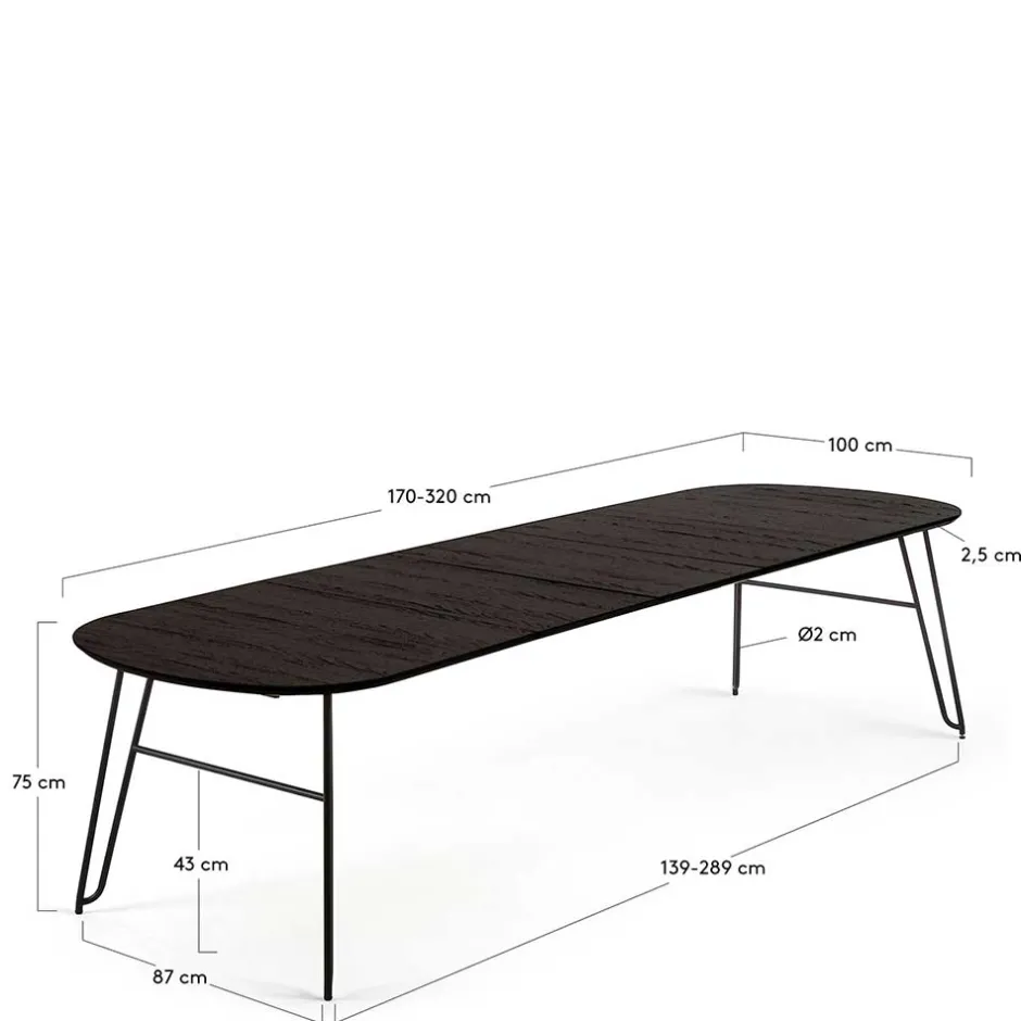 - 002: Breite: 320 / Tiefe: 100 / verlängerbar um je 50 cm, von 170 bis auf 320 cm / mit Kulissenauszug mit drei Einlegeplatten / für zehn Personen