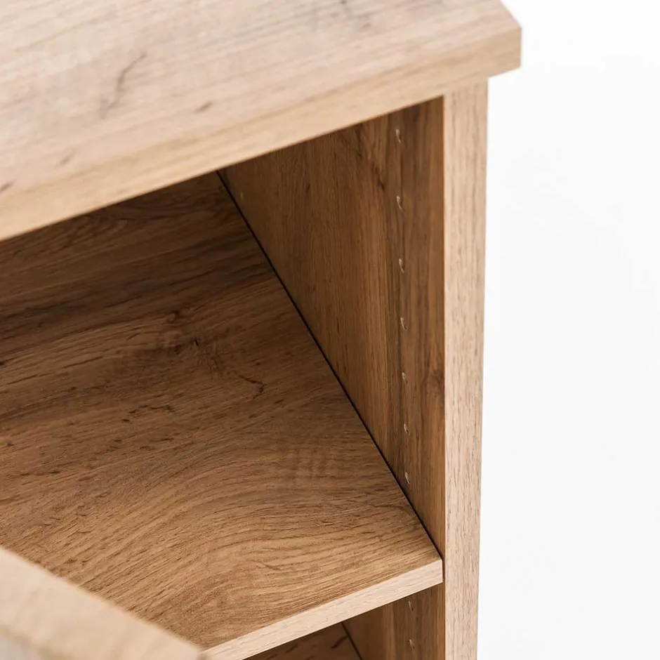 - Oberflächen in Holzoptik Wildeiche foliert, Kanten tiefgezogen (Front) und melaminbeschichtet (Korpus), Touchwood, Innendekor weiß