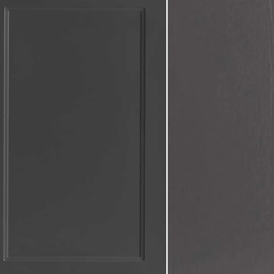 - Korpus melaminbeschichtet in Dunkelgau und Holzoptik, Front dunkelgrau matt foliert