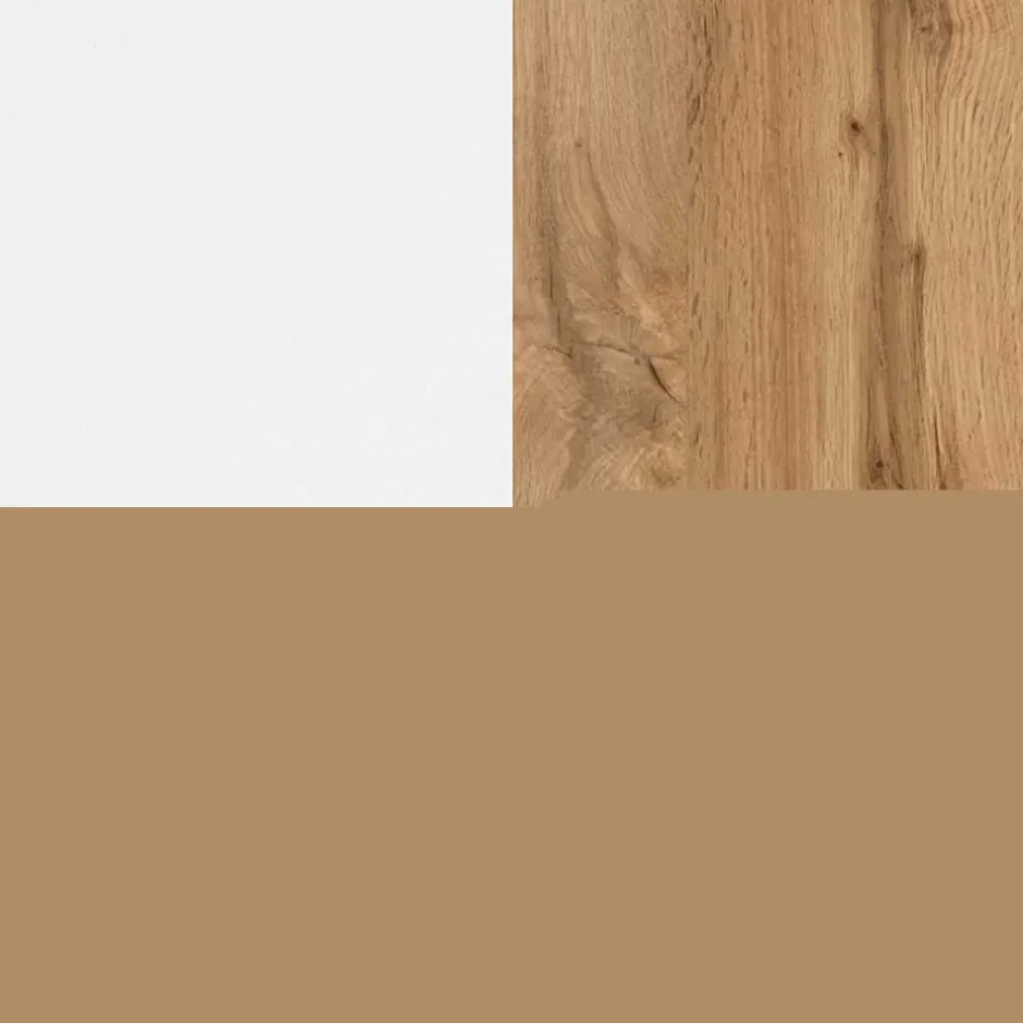 - Front und Rückwand foliert in matt Weiß, Korpus und Böden melaminbeschichtet in Holzoptik Wildeiche