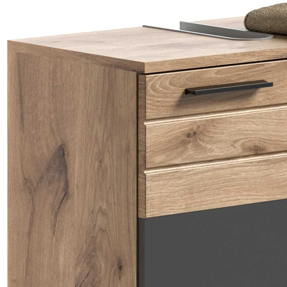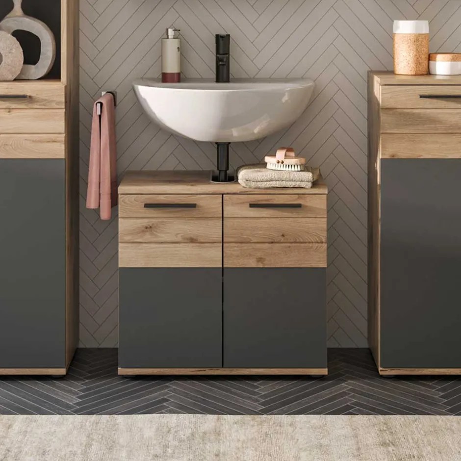 - Top Waschbeckenunterschrank in Wildeichefarben und Grau