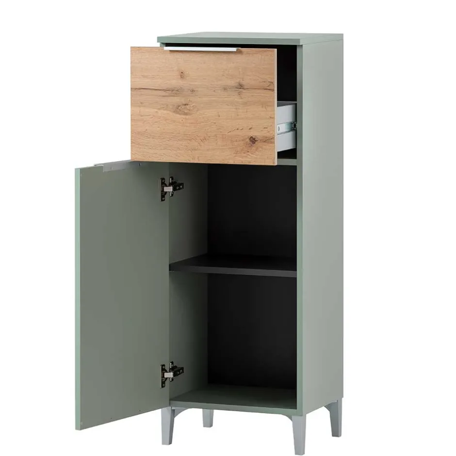 - Trendstarke Badmöbel in Graugrün und Eichefarben