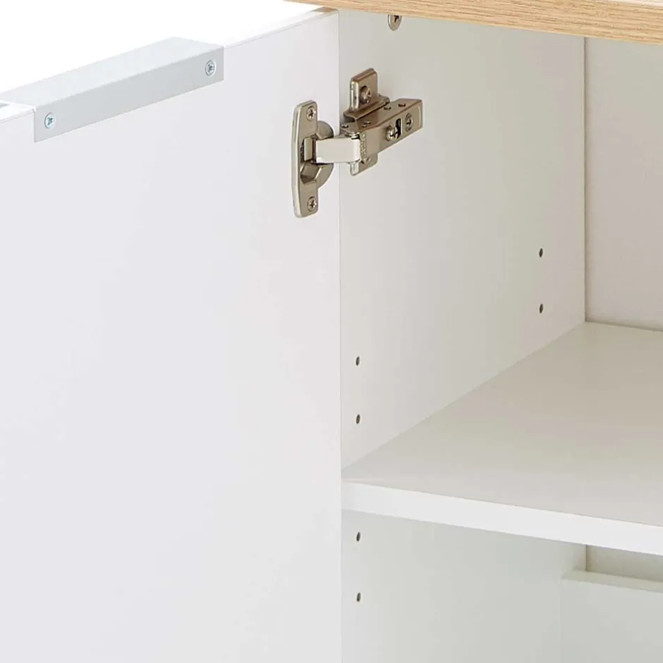 - Holzwerkstoff-Oberflächen mit Melaminharzbeschichtung, Oberboden in Holzoptik Eiche, Korpus in Weiß, Türen zusätzlich mit Einscheibensicherheitsglas beschichtet