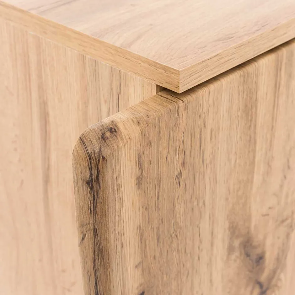 - Oberflächen in Holzoptik Wildeiche foliert, Kanten tiefgezogen (Front) und melaminbeschichtet (Korpus), Touchwood, Innendekor weiß