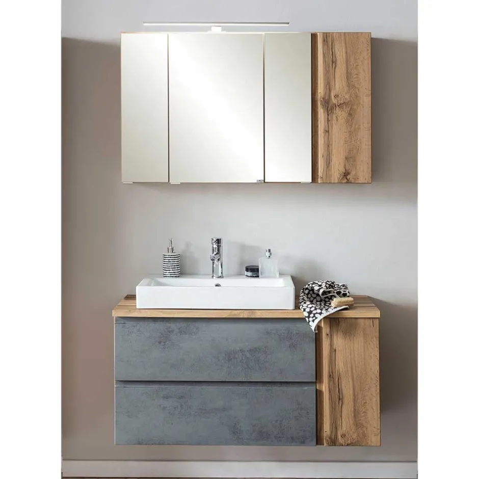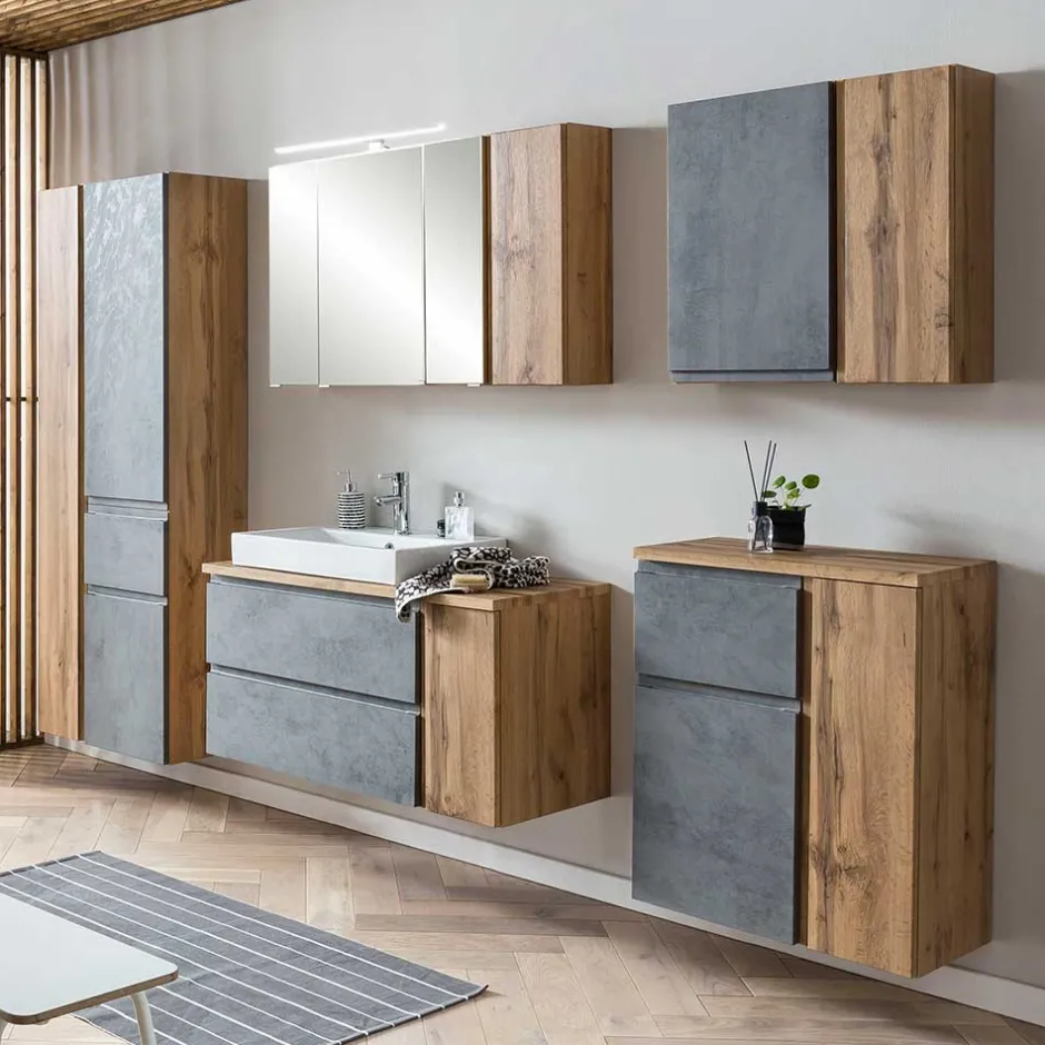 - Trendige Badmöbel in Betongrau und Wildeichefarben
