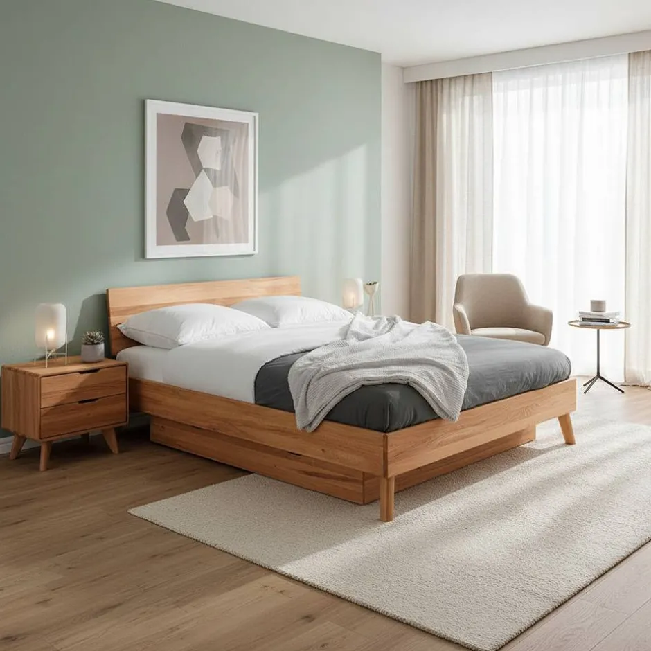 - Außerordentliches Bett in Kernbuchefarben mit Bettkasten