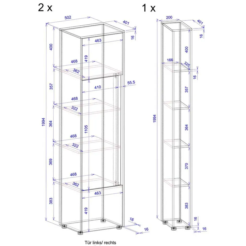 - Fünf Fächer in Ordnerhöhe, Innenmaße (BxHxT): ca. 46,8x40x36,2 cm, 46,8×35,7×32,2 cm, 46,8×36,4×32,2 cm, 46,8×36,9×36,2 cm, 46,8×38,3×36,2 cm