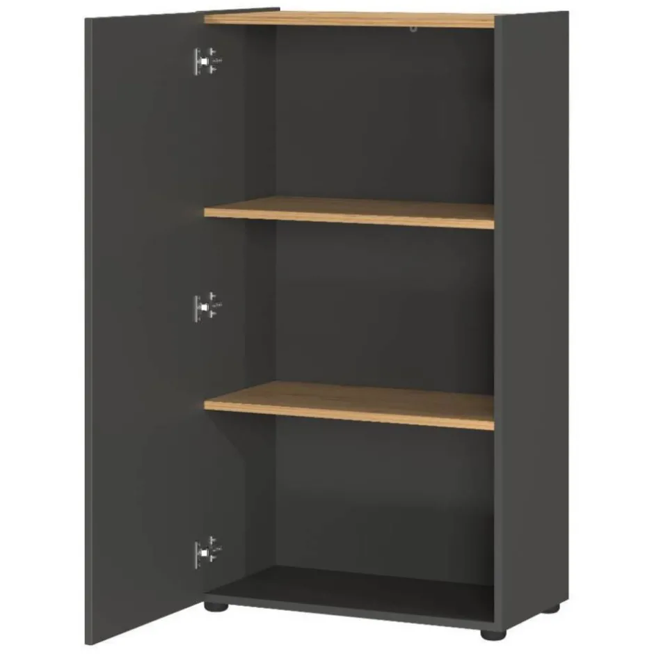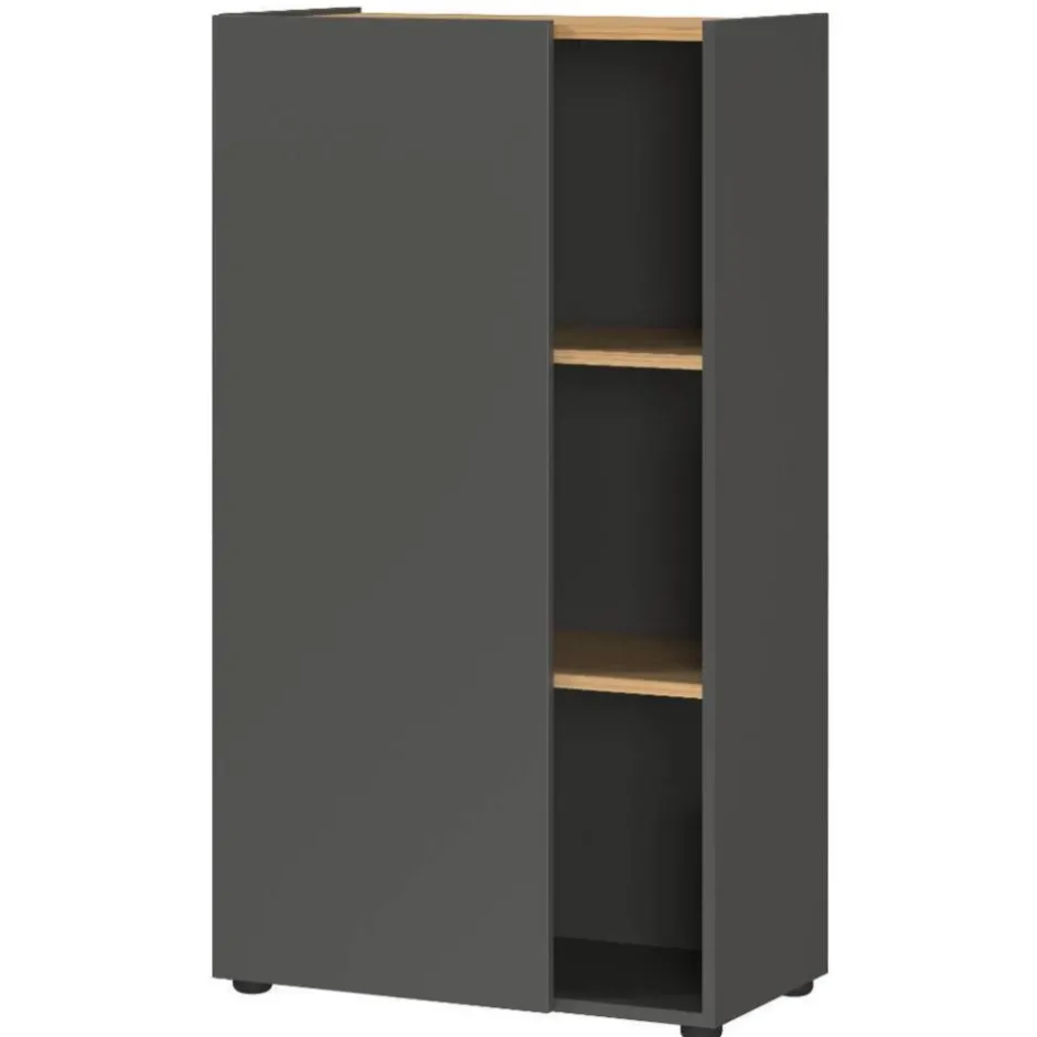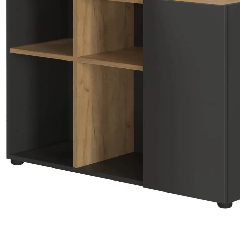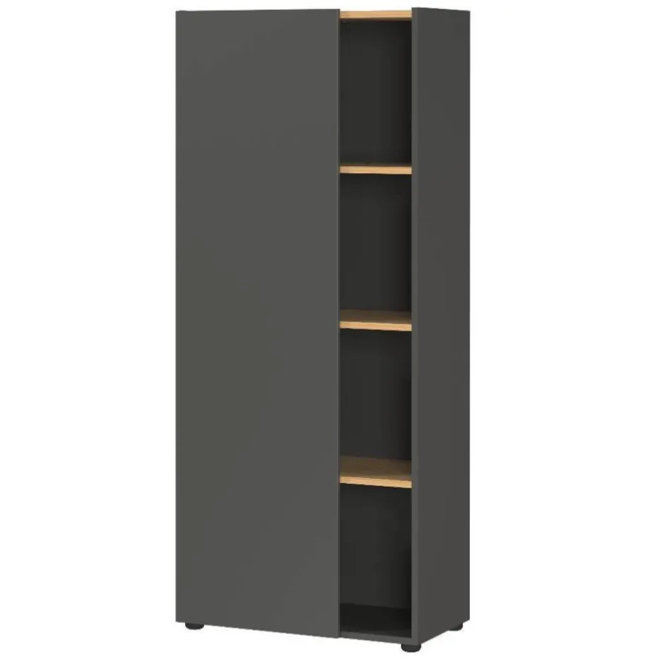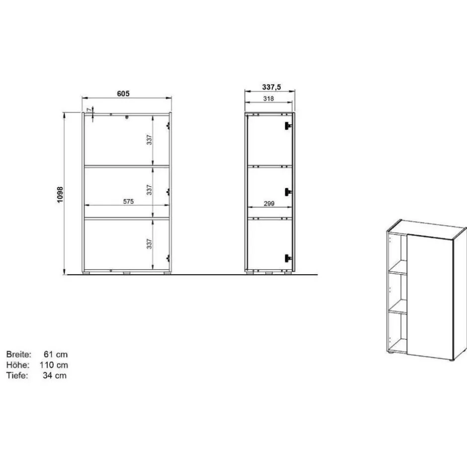 - Im Schrankelement befindet sich eine Tür und vier offene Fächer