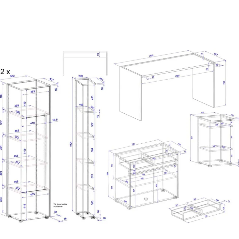 - Standfestes Wangengestell und flache Kunststoffgleiter, zusätzliche Kippsicherung an der Wand bei den hohen Möbeln erforderlich