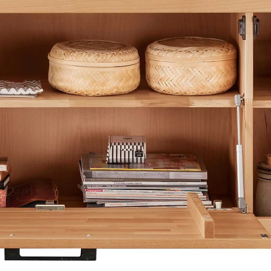 - Mittig befindet sich eine nach unten zu öffnende Klappe mit Gasdruck Beschlägen, innen zwei große Staufächer
