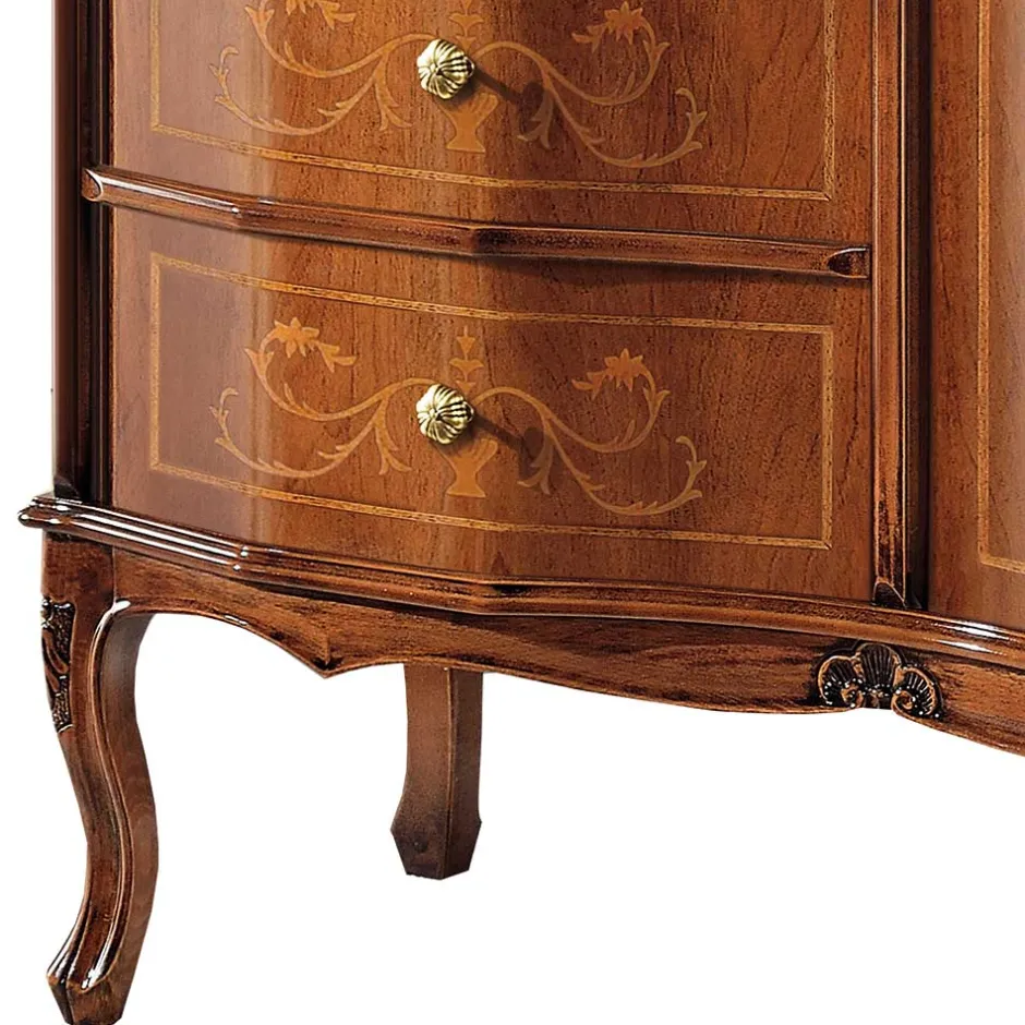 - Holzoberfläche lackiert, MDF mit Nussbaumholz furniert, Intarsien aus Pappelholz, gesamt lackiert