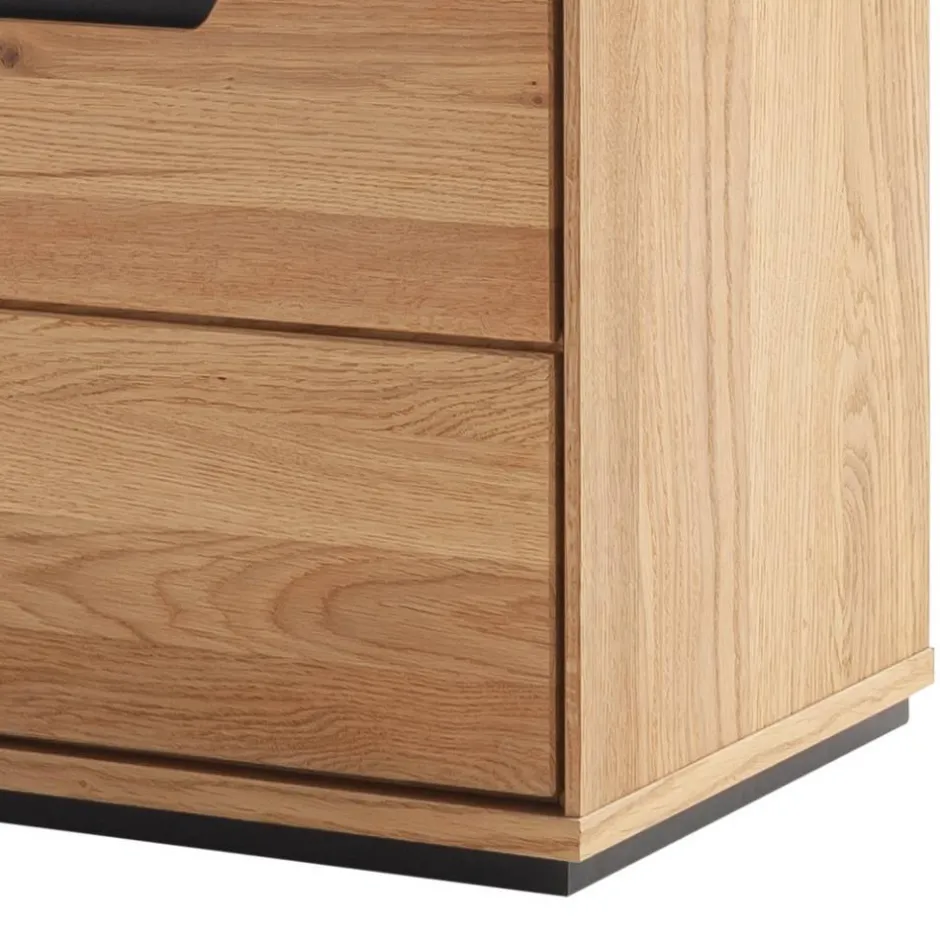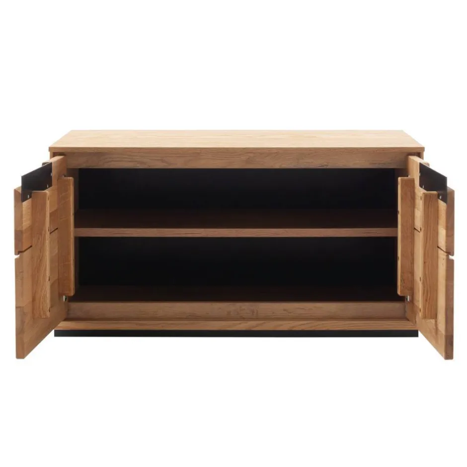 - Massivholz geölt, Holzwerkstoff außen echtholzfurniert und geölt, innen in Holzoptik foliert