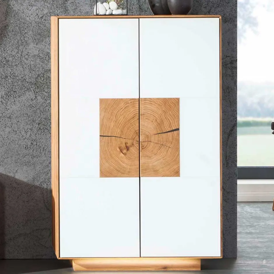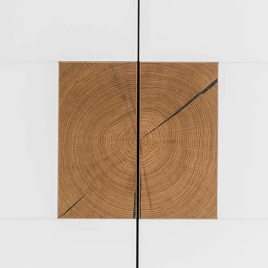 - Türen aus solider MDF mit satinierter Glasfront in Weiß und einer einzigartigen Applikation aus Hirnholz