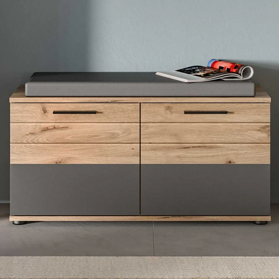 - Kontraststarke Garderobenmöbel in Wildeichefarben und Grau