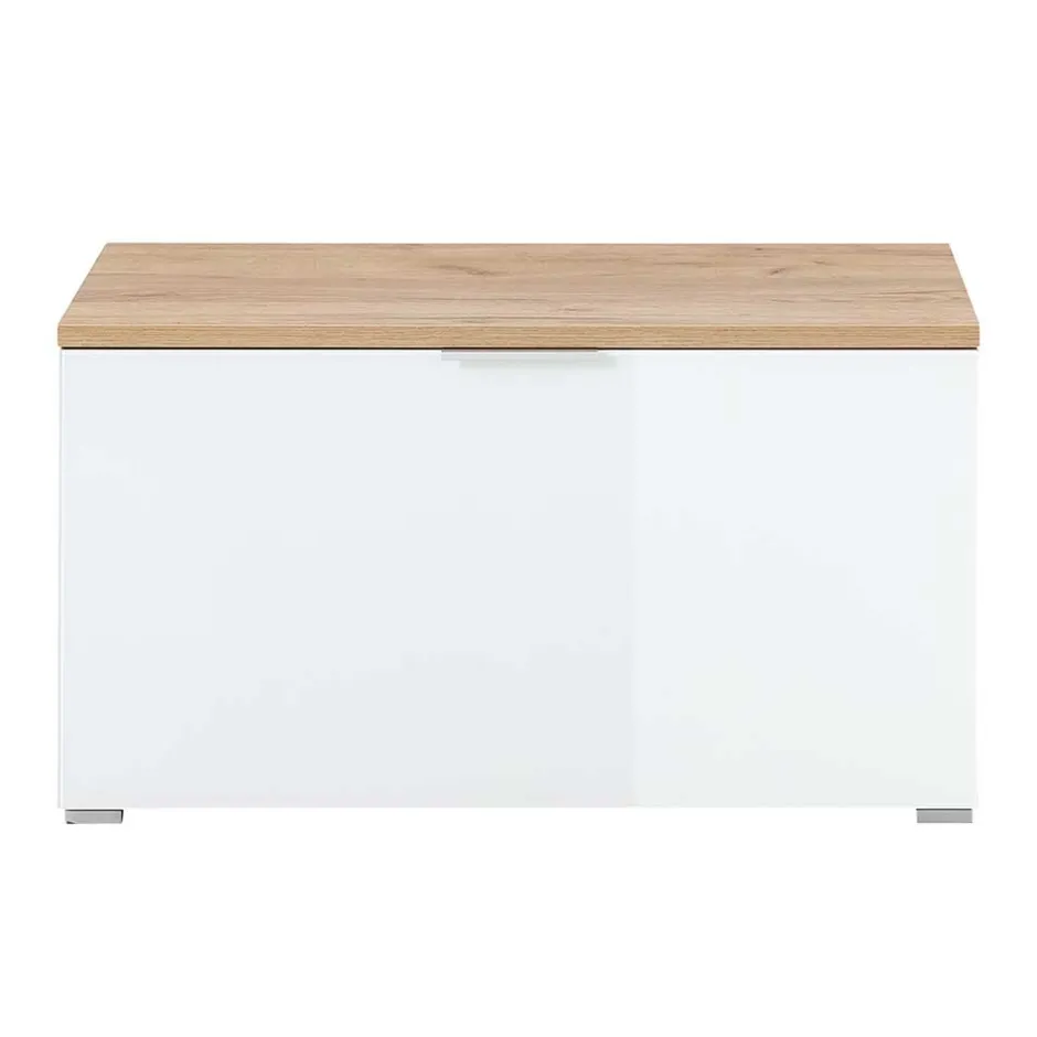 - Oberflächen melaminharzbeschichtet in Weiß und Holzoptik Eiche (Korpus), Front zusätzlich mit Glas beschichtet