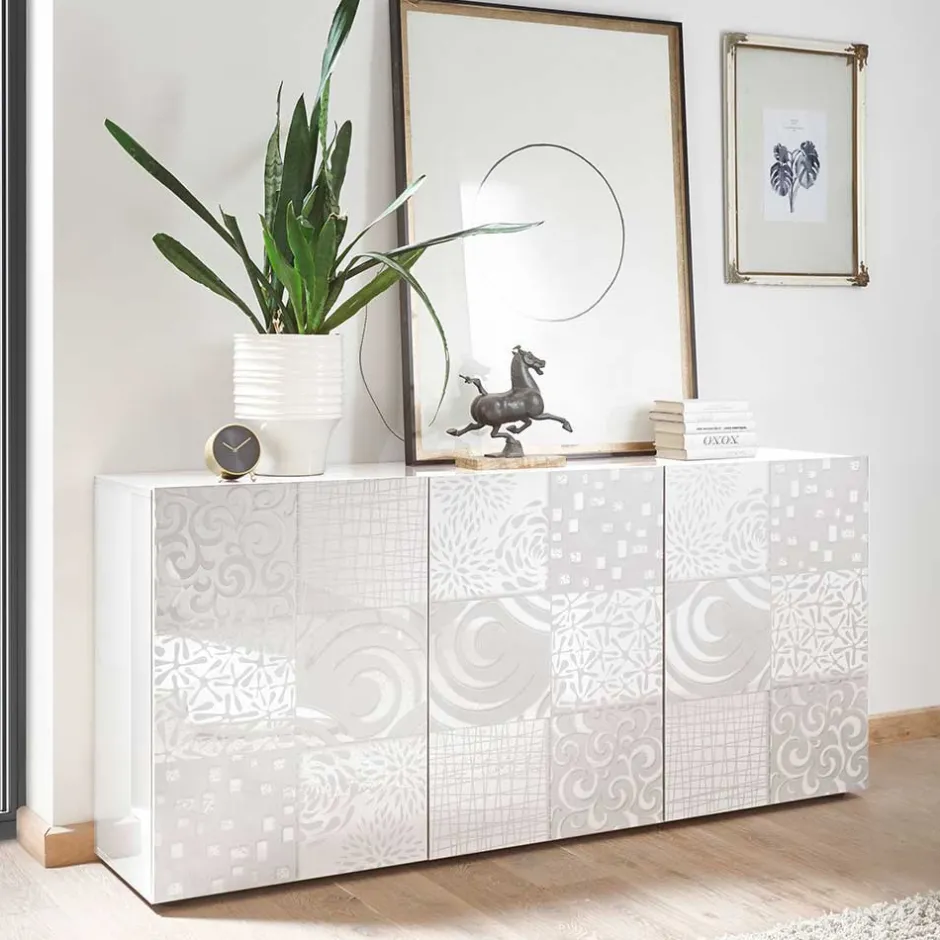 - Oberflächen lackiert in Weiß Hochglanz, Fronten mit aufwändigem Siebdruck gestaltet