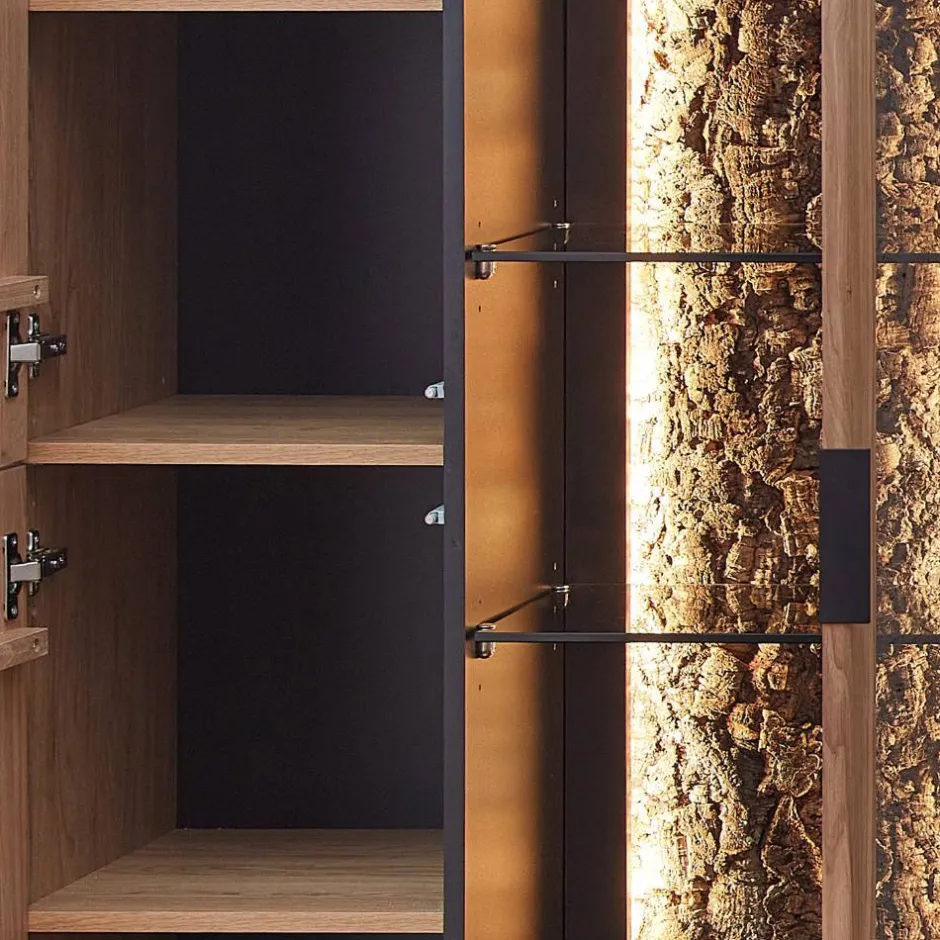 - Holzoberflächen lackiert, Front Eiche Bianco gebürstet, Korpus außen echtholzfurniert in Wildeiche Bianco und innen in Holzoptik foliert, Absetzungen Anthrazit