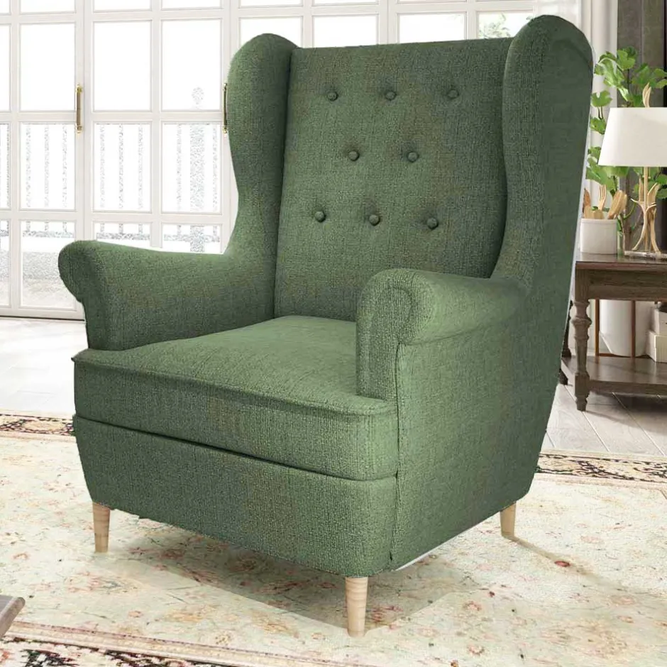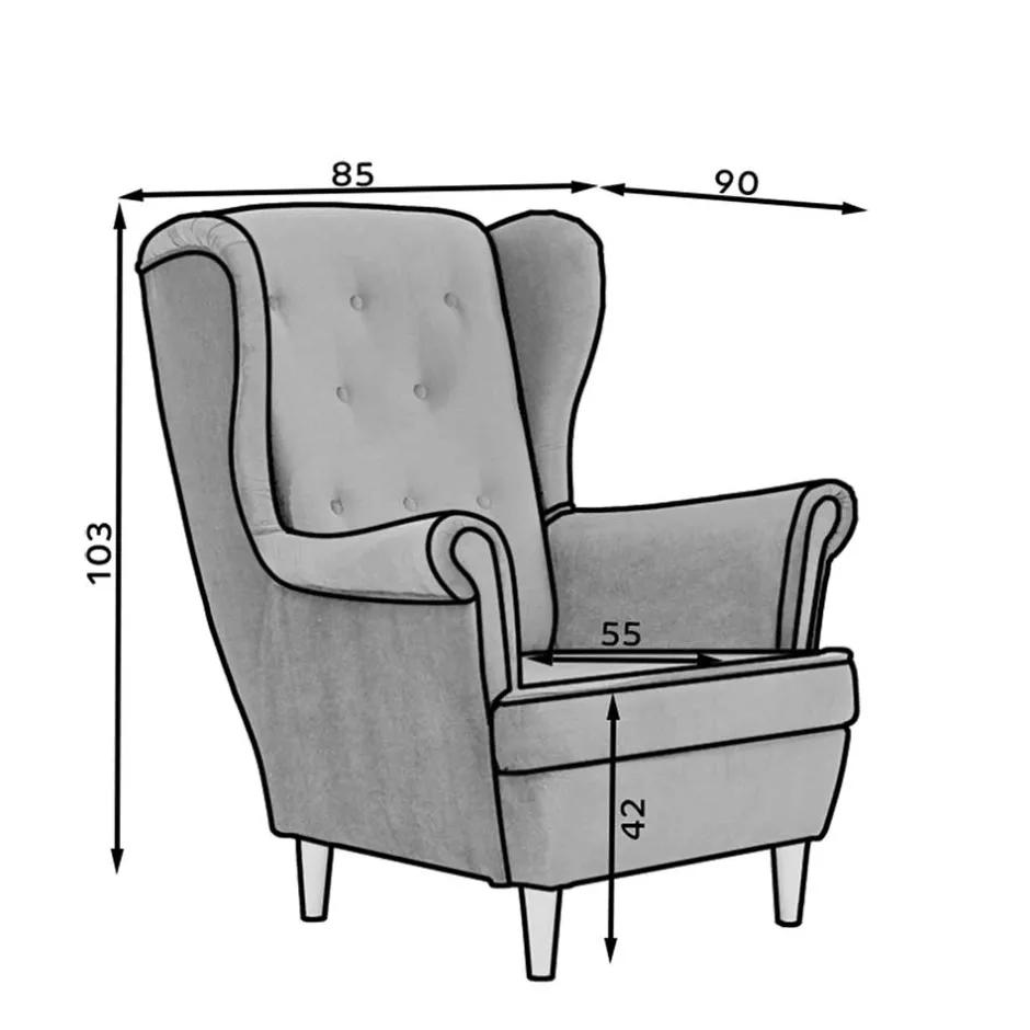 - Hohe, leicht nach hinten geneigte Rückenlehne mit dekorativen Zierknöpfen
