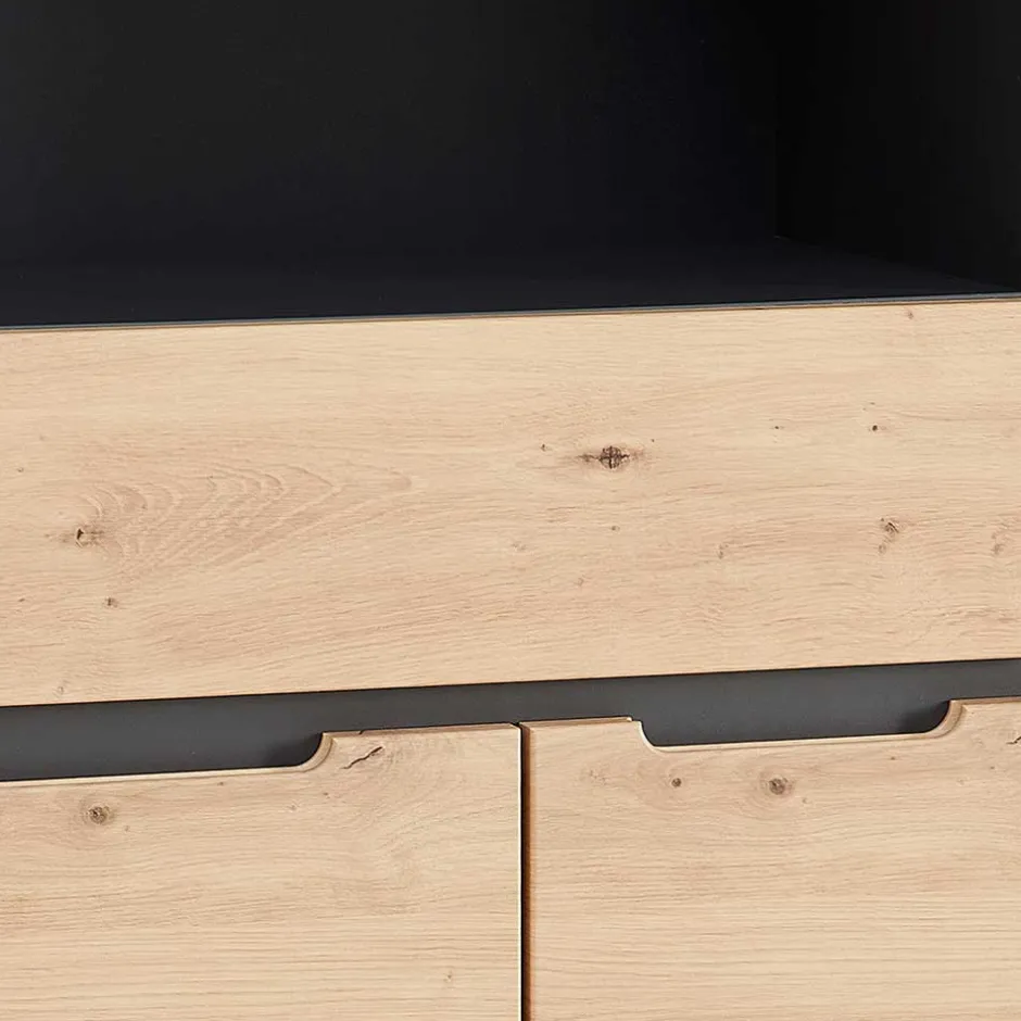 - Pflegeleicht folierte Oberflächen in Holzoptik Wildeiche und Dunkelgrau, Front mit tiefgezogenen Kanten