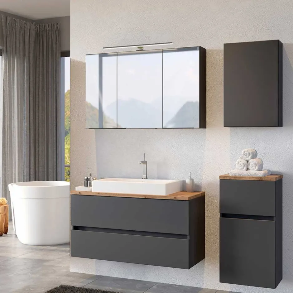 - Erstklassiges Badmöbel Set in Dunkelgrau und Wildeichefarben