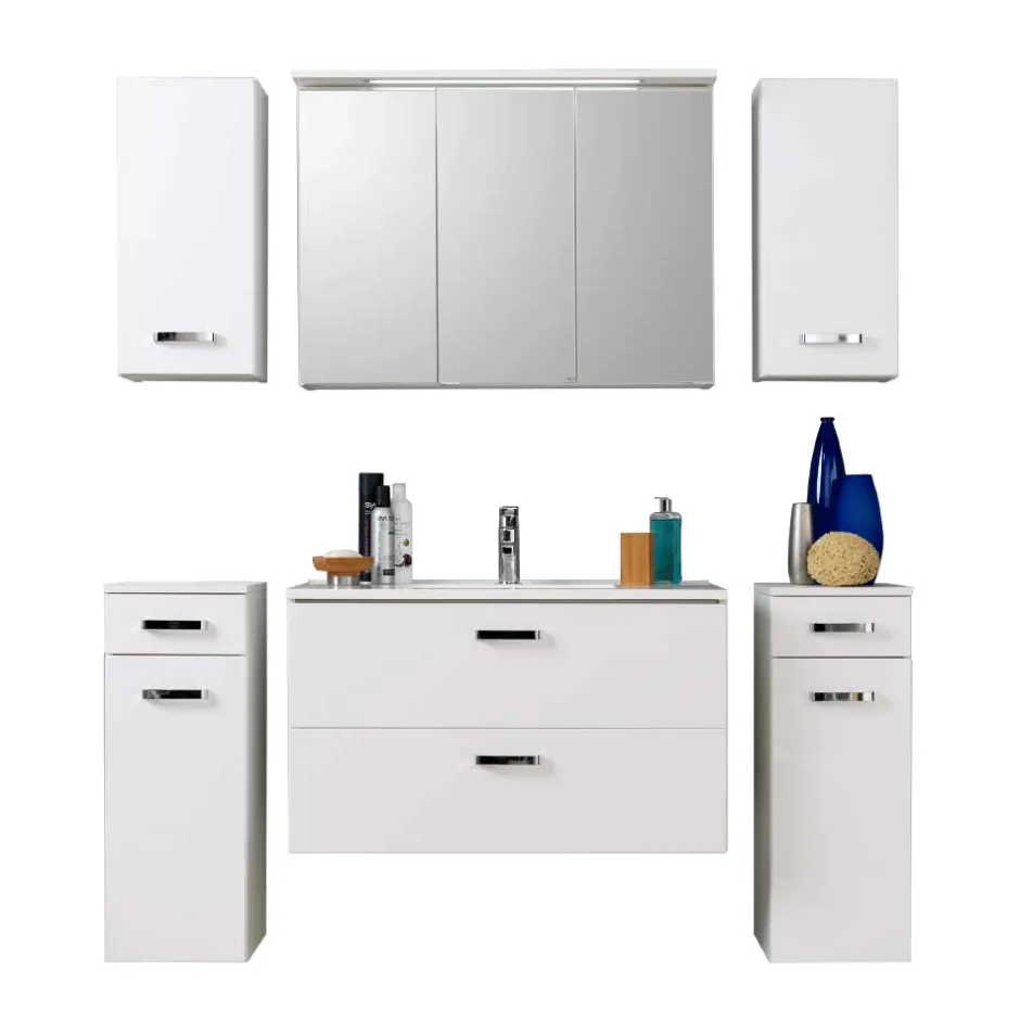 - Vorteilsset bestehend aus 3-D-Spiegelschrank, Waschtisch, zwei Unterschränken und zwei Hängeschränken