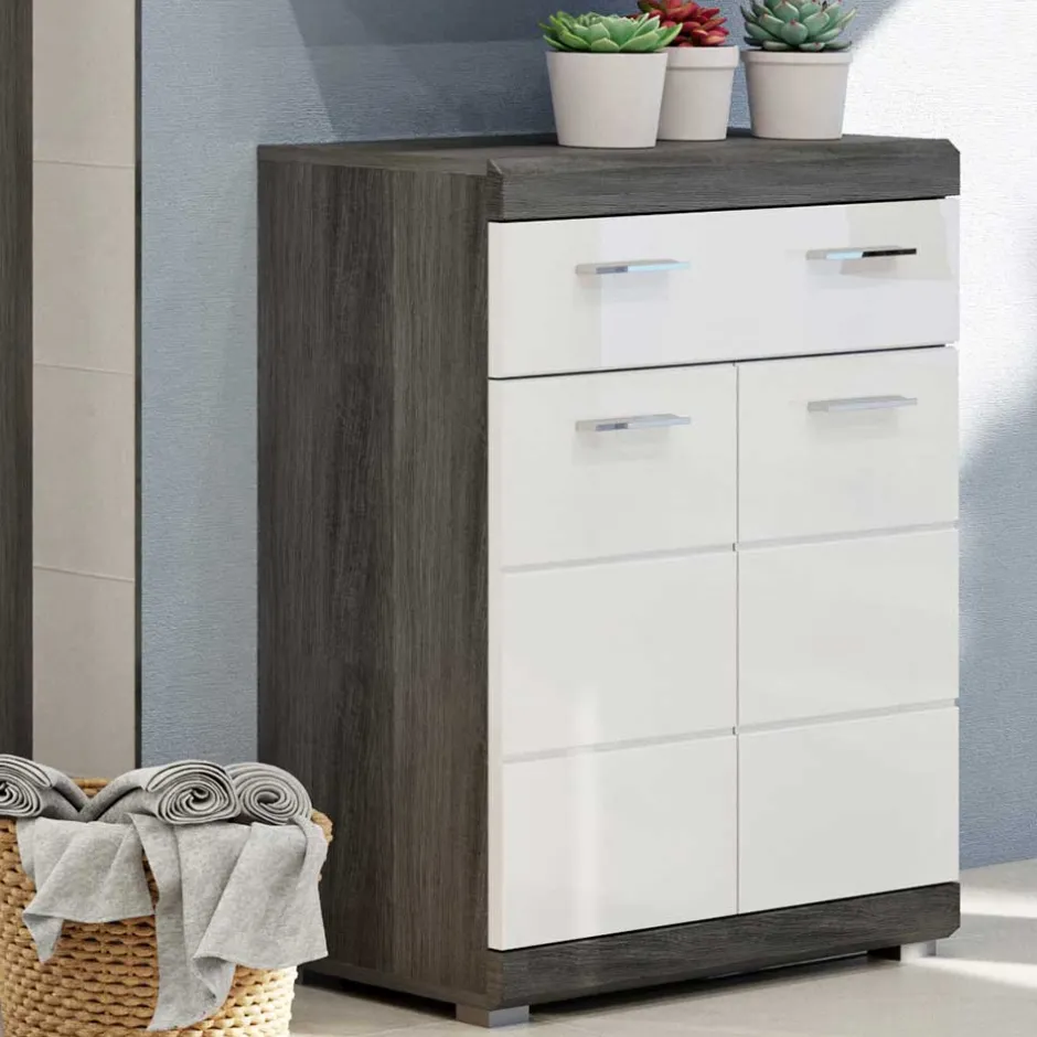 - Oberflächen in Holzoptik Rauchgrau melaminbeschichtet und Weiß foliert, Kanten tiefgezogen