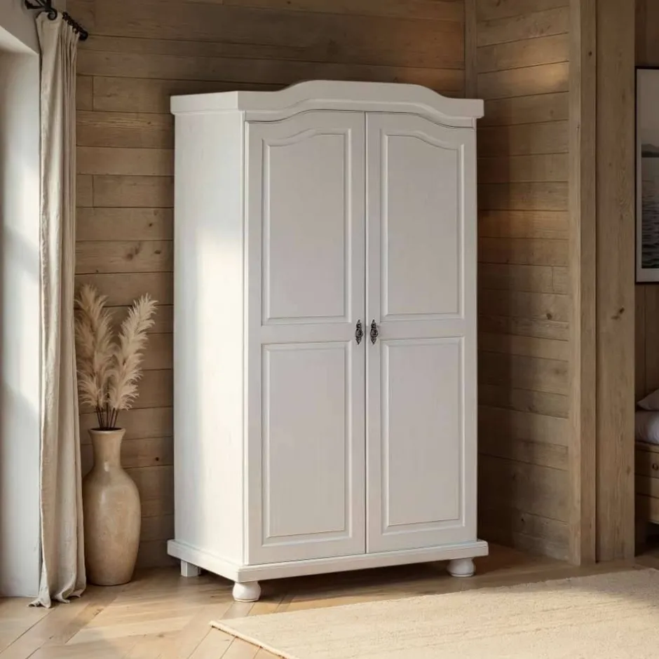 - Innen rechts ein Einlegeboden und eine Kleiderstange, links drei Einlegeböden