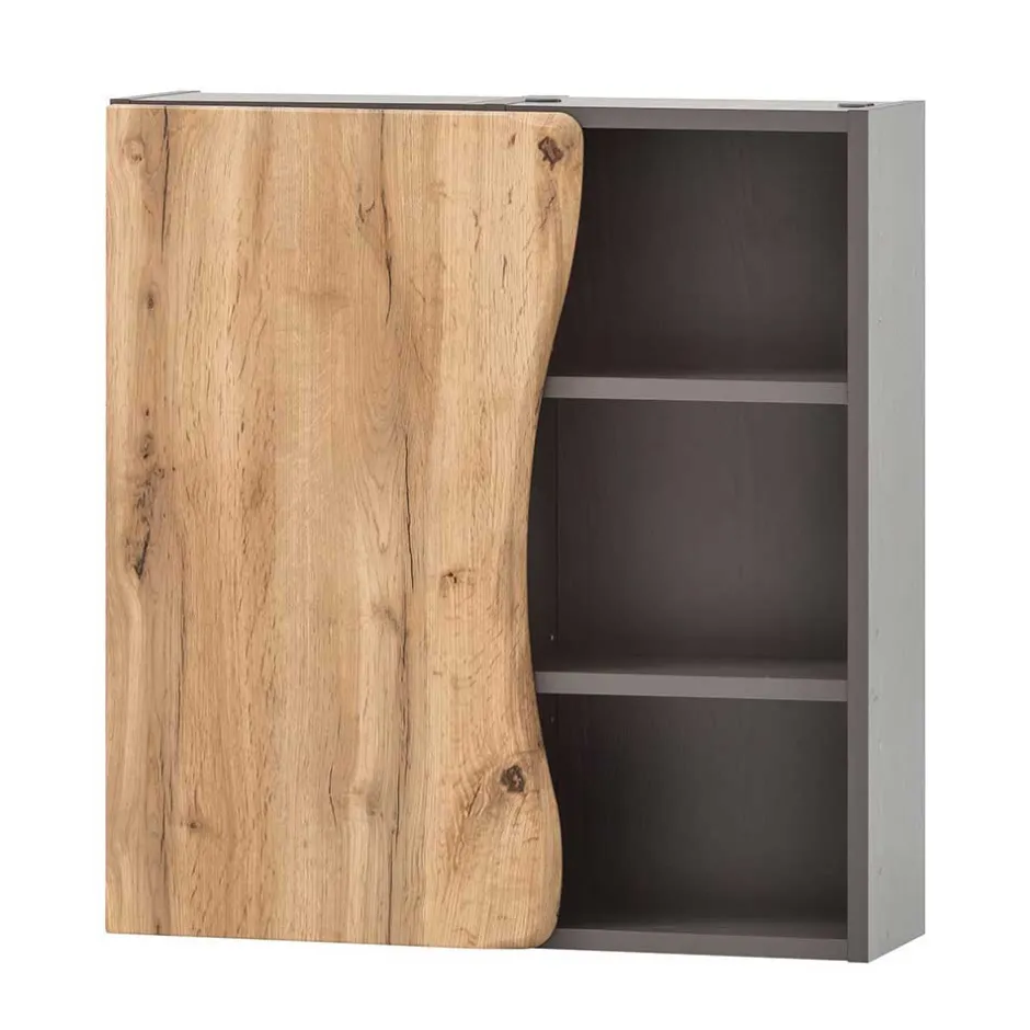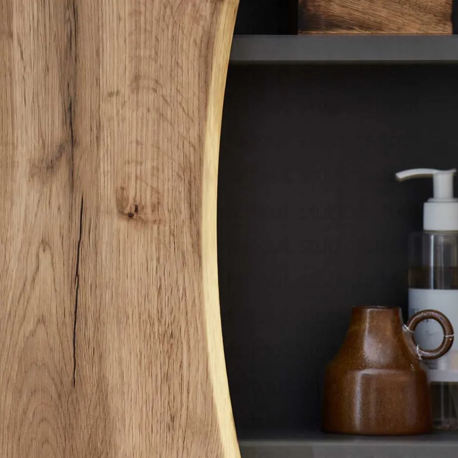 - Oberflächen in Holzoptik Wildeiche foliert, Kanten tiefgezogen (Front) und melaminbeschichtet (Korpus), Touchwood, Innendekor weiß
