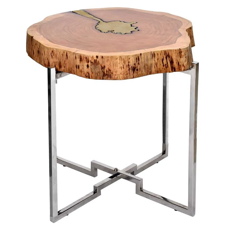 - Außergewöhnlicher Beistelltisch in Akazie und Silberfarben