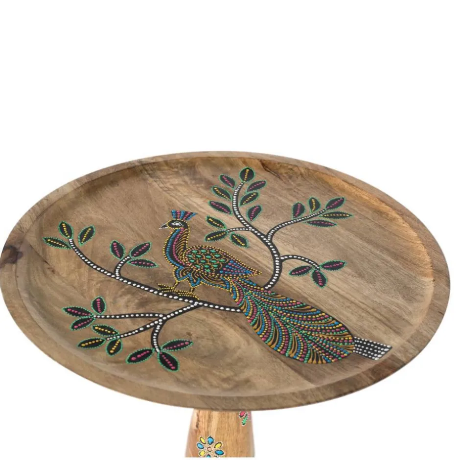 - Tischplatte aufwändig mit einem Pfau verziert, umlaufender Rand