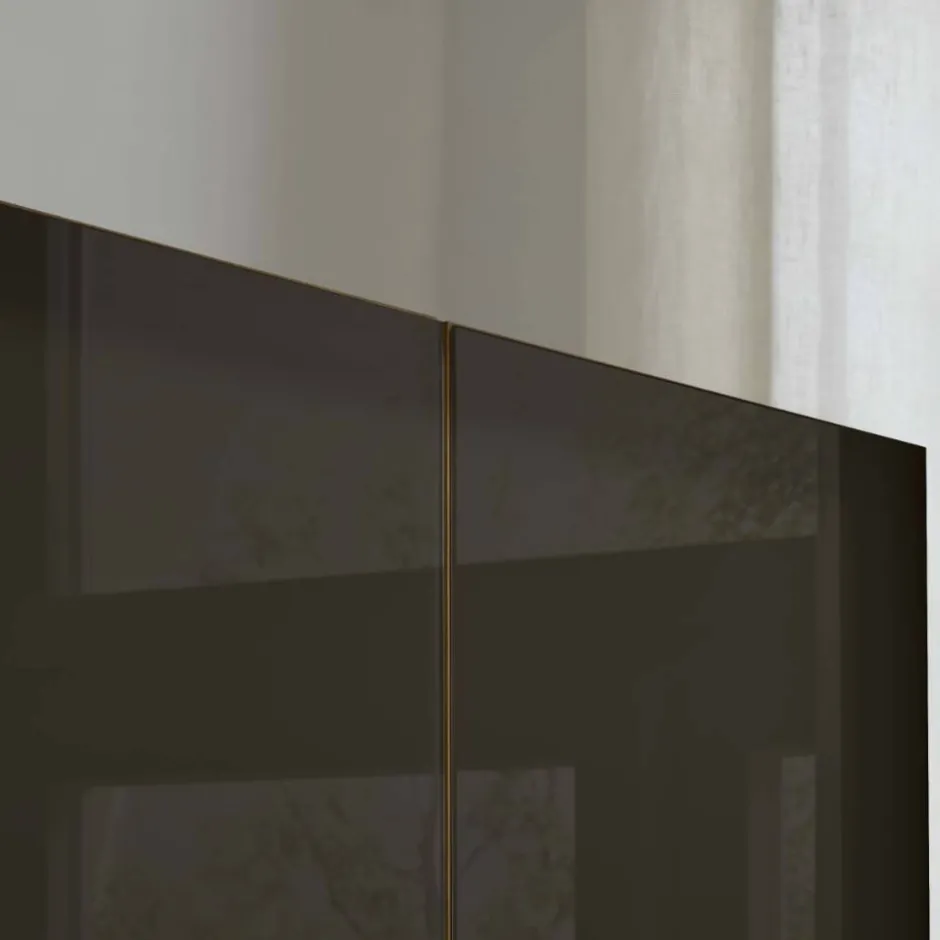 - Acht Türen aus Holzwerkstoff mit dunkelbrauner Glasbeschichtung, Bauchbinde Massivholz, Soft Close Metallscharniere
