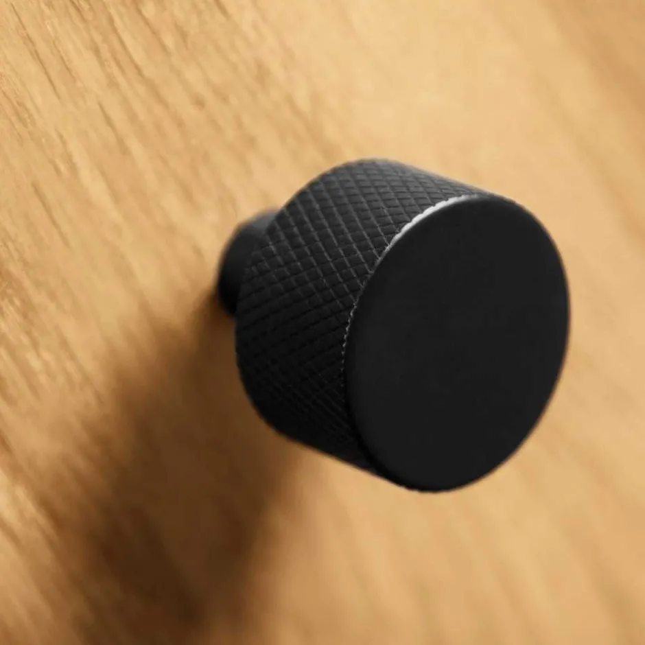 - Schwarze, zylinderförmige Metallgriffe mit eingraviertem Rautenmuster