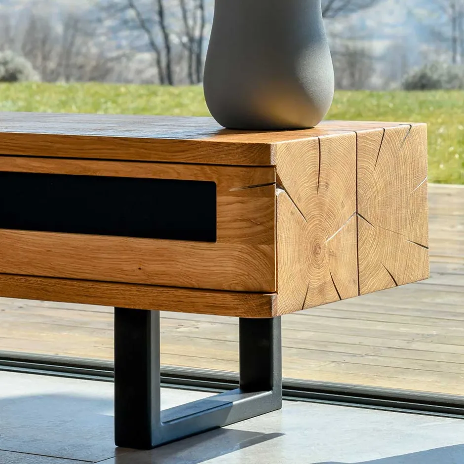 - Geschwungener Holzbalken und ein Metallbügel als Standfläche