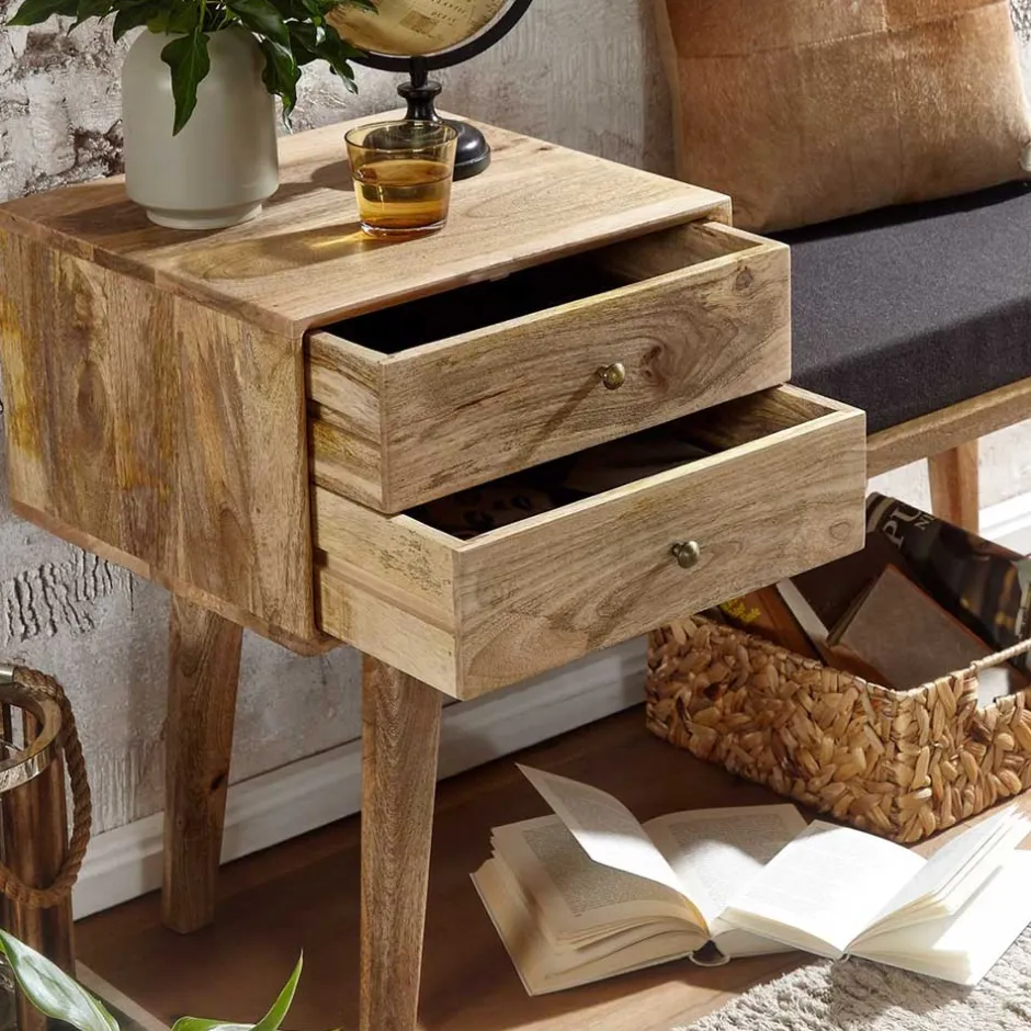 - Zwei Schubladen mit Holzauszug und Knopfgriffen