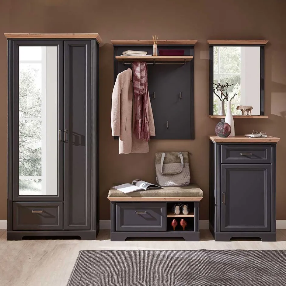 - Zeitlose Garderobenkombination in Dunkelgrau und Eichefarben