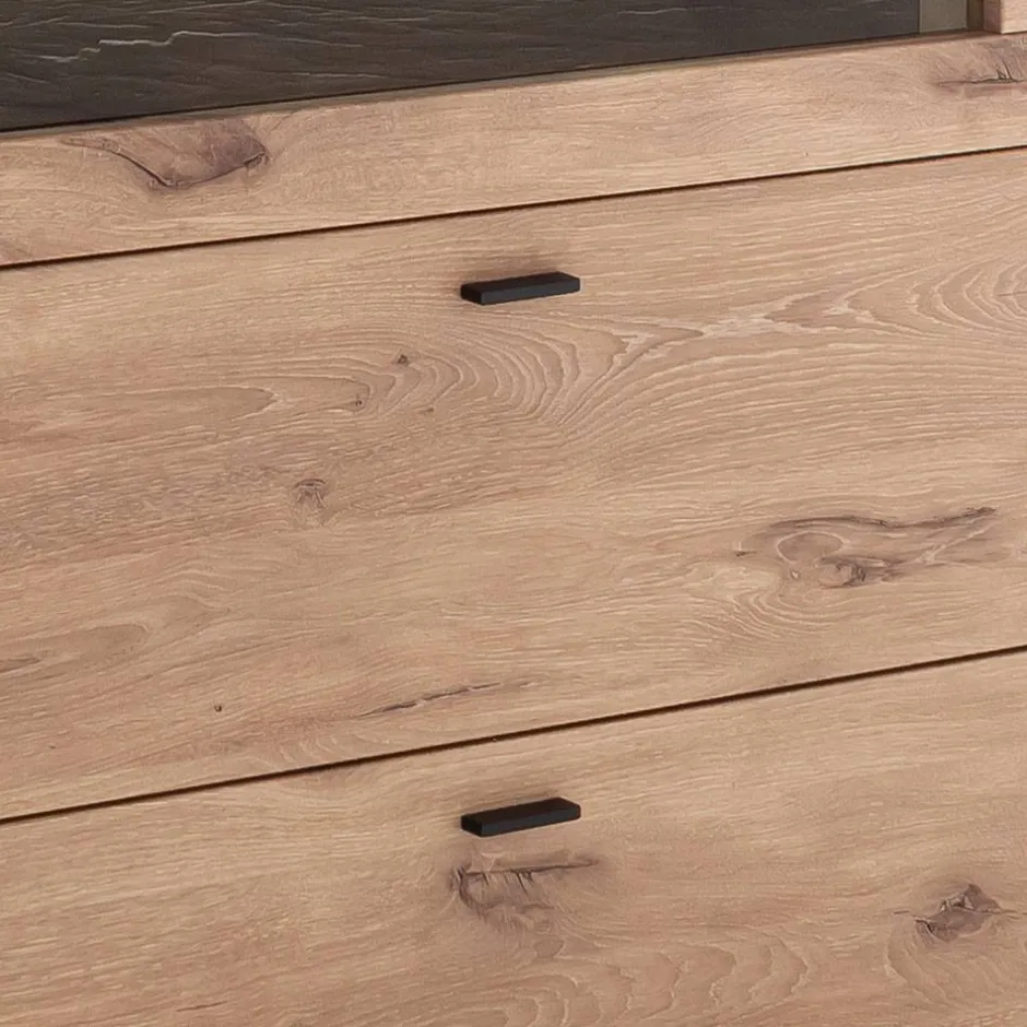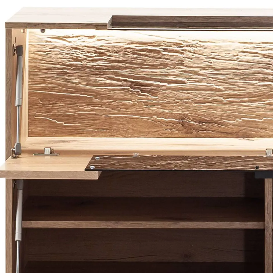 - HDF Rückwand innen in Holzoptik foliert, zusätzlich in 3D Holzoptik sandgestrahlt beschichtet