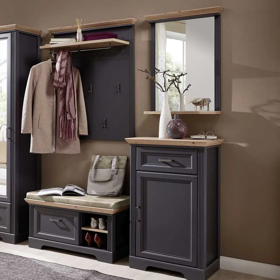 - Modische Garderobenkombination in Dunkelgrau und Eichefarben