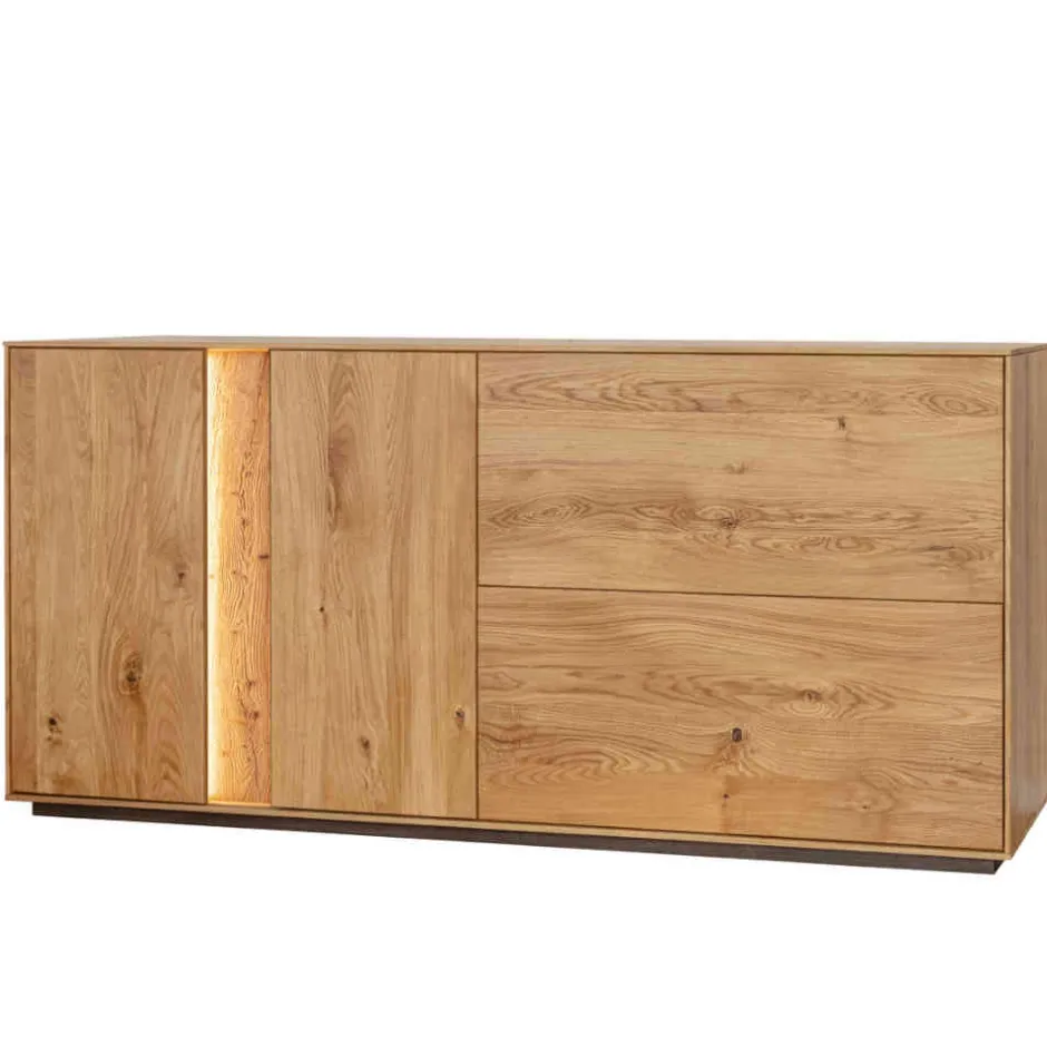 - Die LED-Beleuchtung betont die raue Holzstruktur der Blende zwischen den Türen
