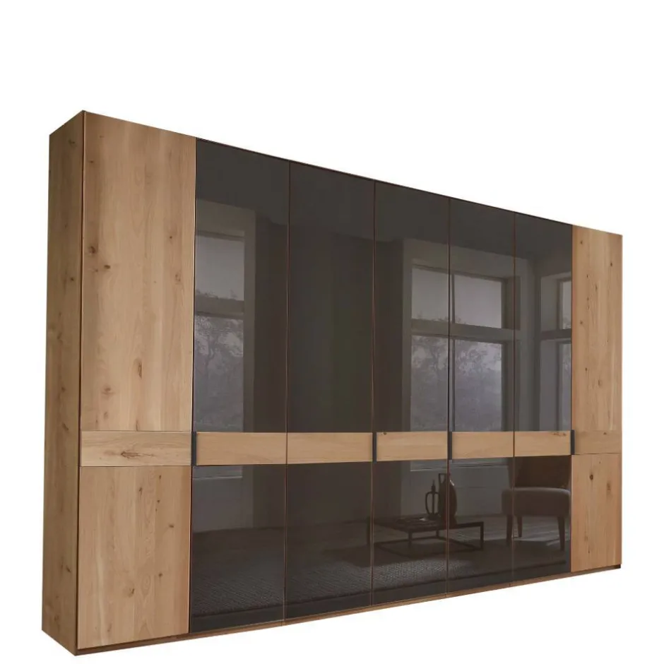 - Sieben Drehtüren mit Soft Close Metallscharnieren, fünf aus Holzwerkstoff mit Glasbeschichtung in Dunkelbraun, Bauchbinden und äußere Türen aus Massivholz