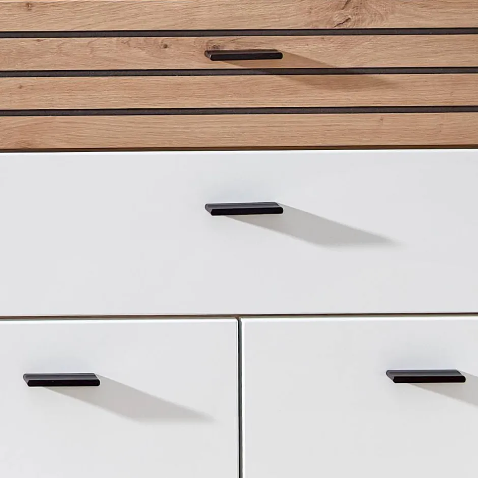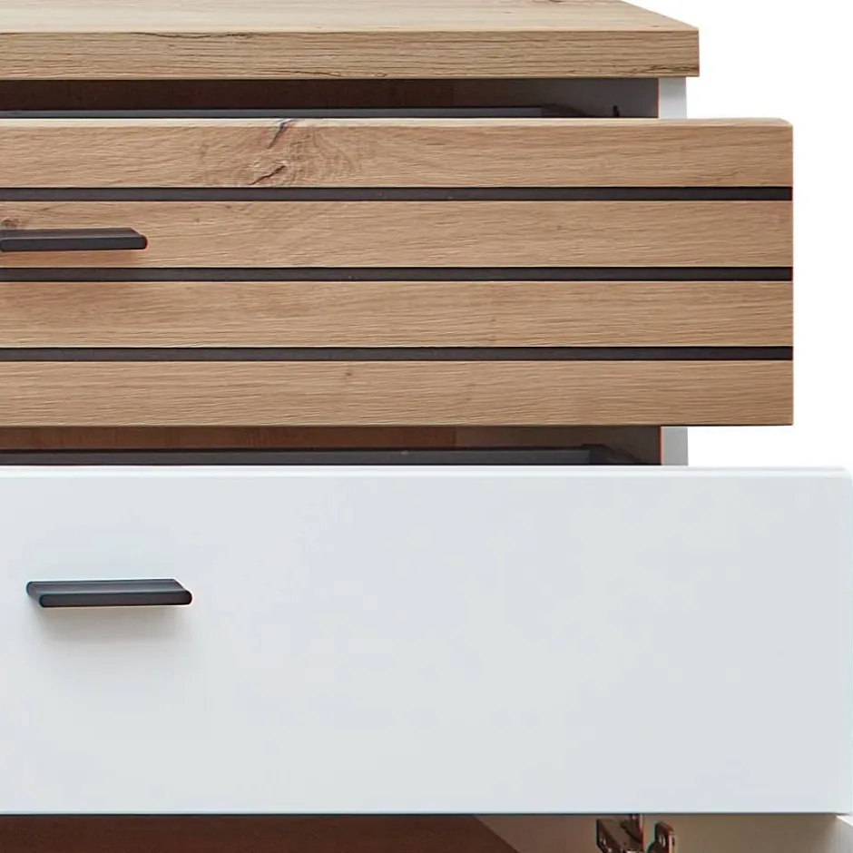 - Oberflächen Korpus weiß melaminbeschichtet, Front in Weiß matt und in Wildeiche Holzoptik foliert