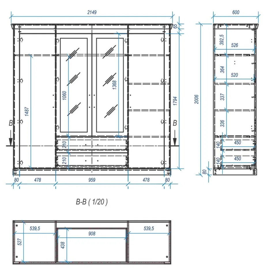 - Hinter der linken Tür und den Doppeltüren befindet sich je ein Boden und eine Kleiderstange, hinter der rechten Tür befinden sich vier Böden
