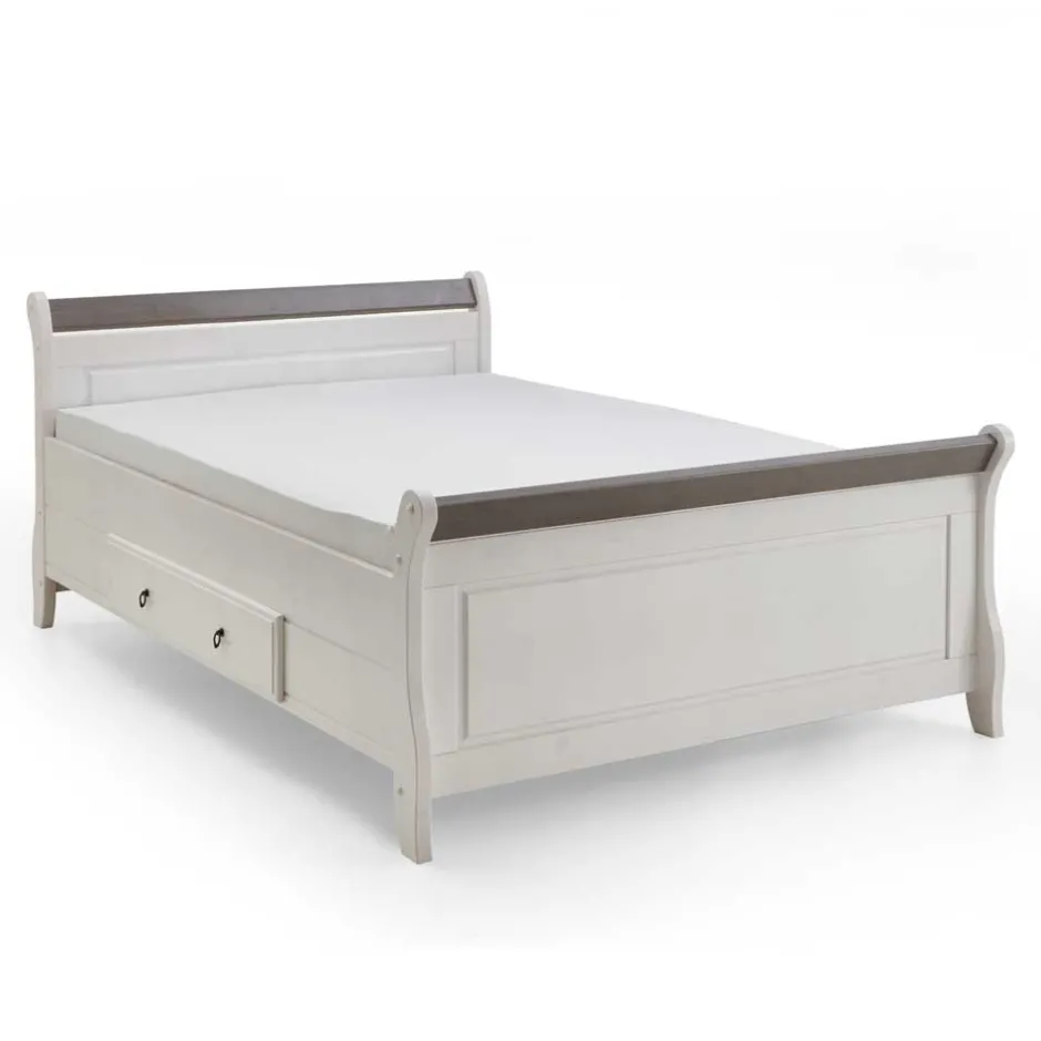 - Gemütlich wirkendes Doppelbett in Weiß abgesetzt mit Kiefer Grau
