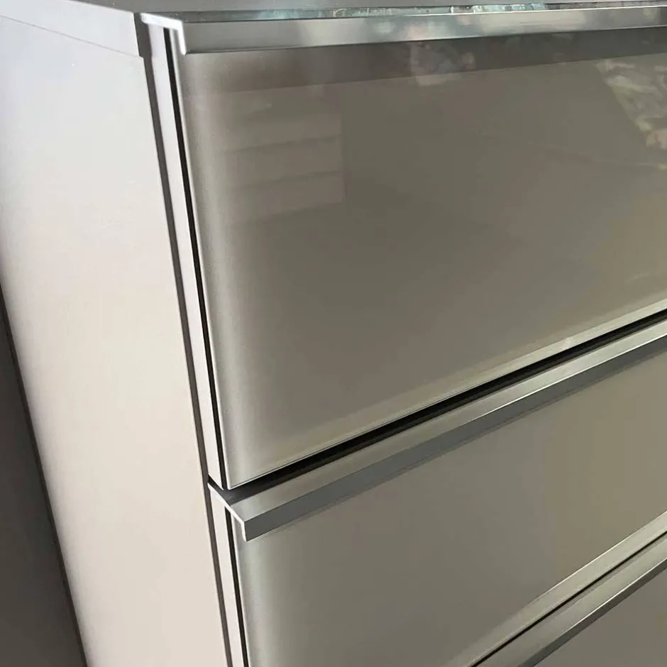 - Oberfläche der Front mit Glas in Hellgrau beschichtet, Korpus in Weiß foliert, Innendekor Silber-Grau gestreift foliert