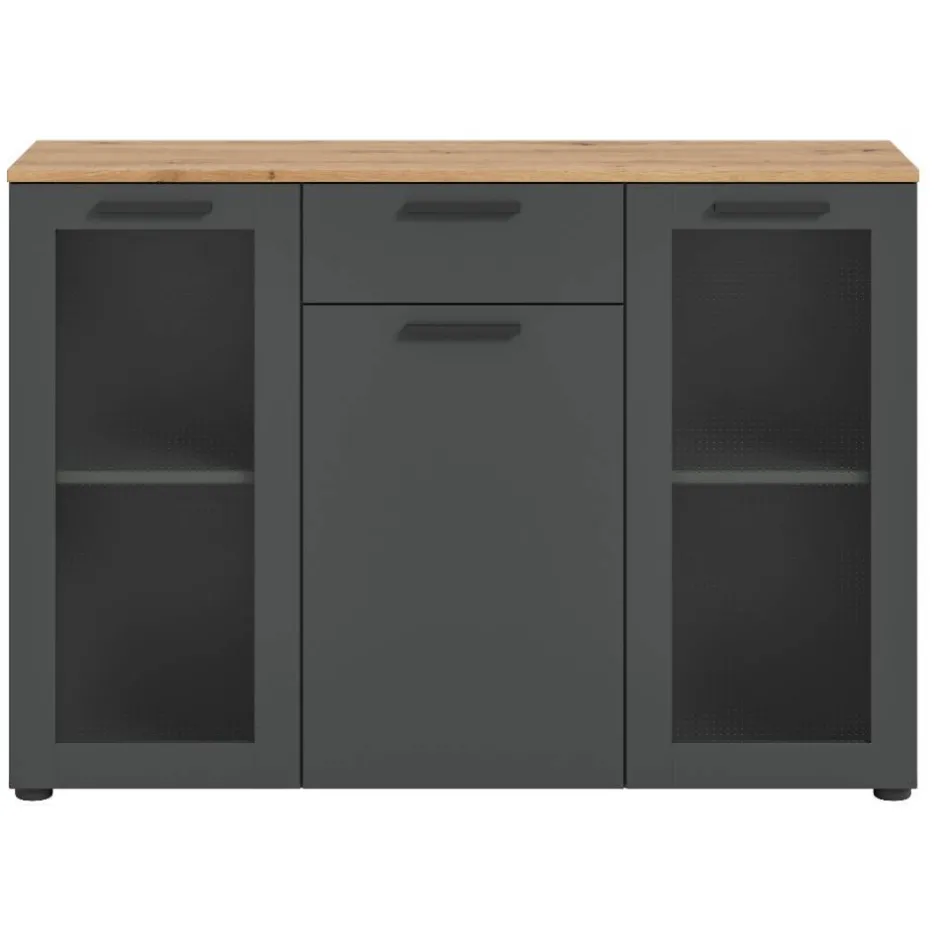 - Geräumige Sideboard Vitrine in Anthrazit und Wildeichefarben