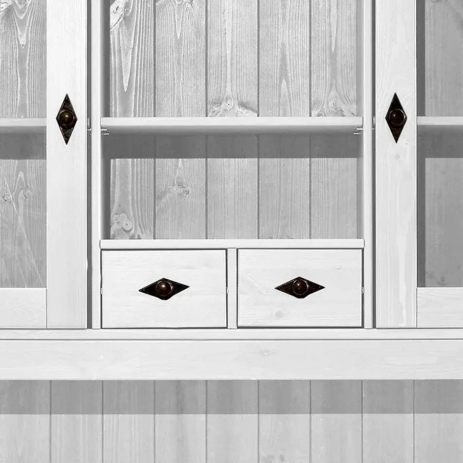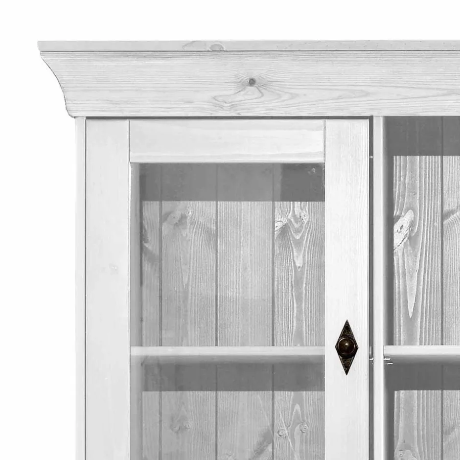 - Aufsatz mit zwei massiv gerahmten Glastüren, drei Türen in dekorativer Kassettenoptik in der Anrichte