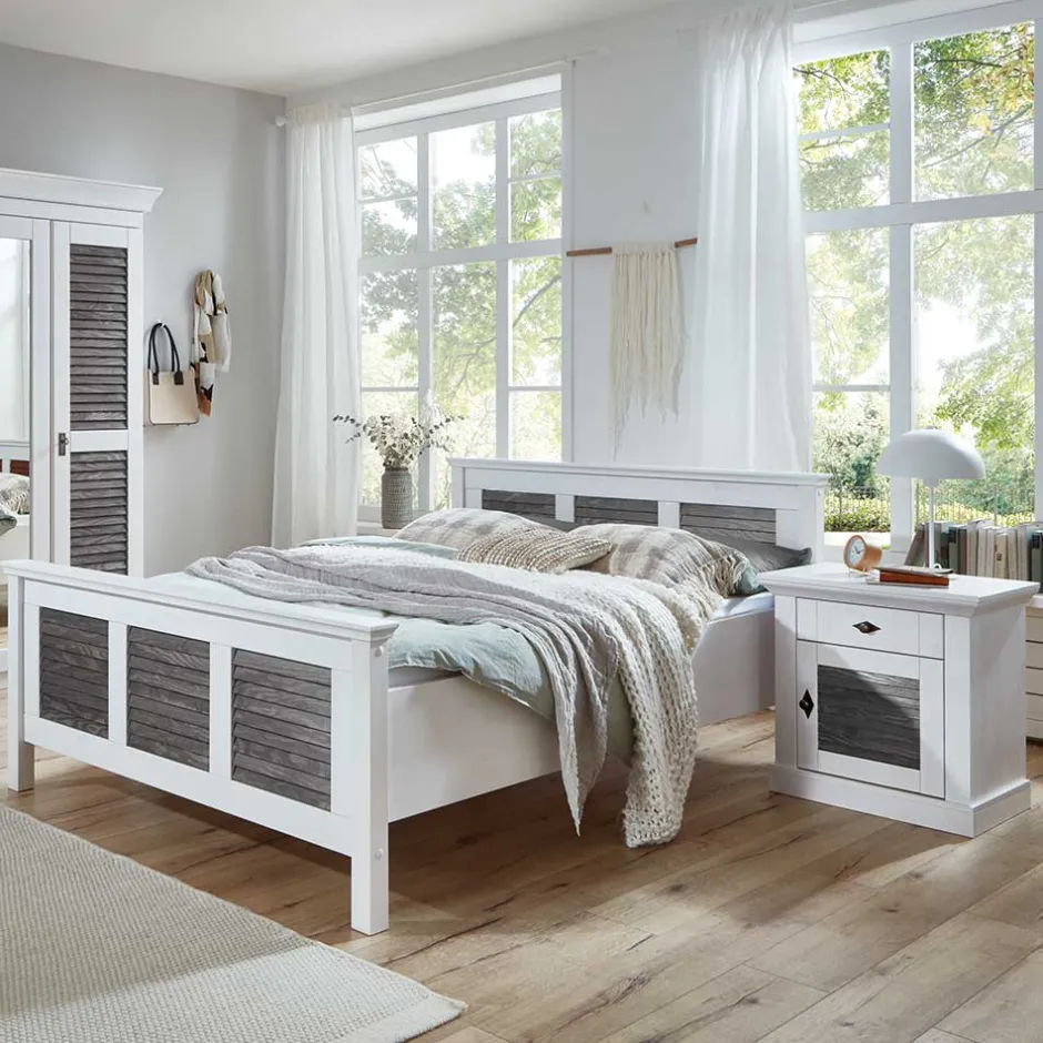 - Trendstarkes Bett in Weiß und Kiefer Grau