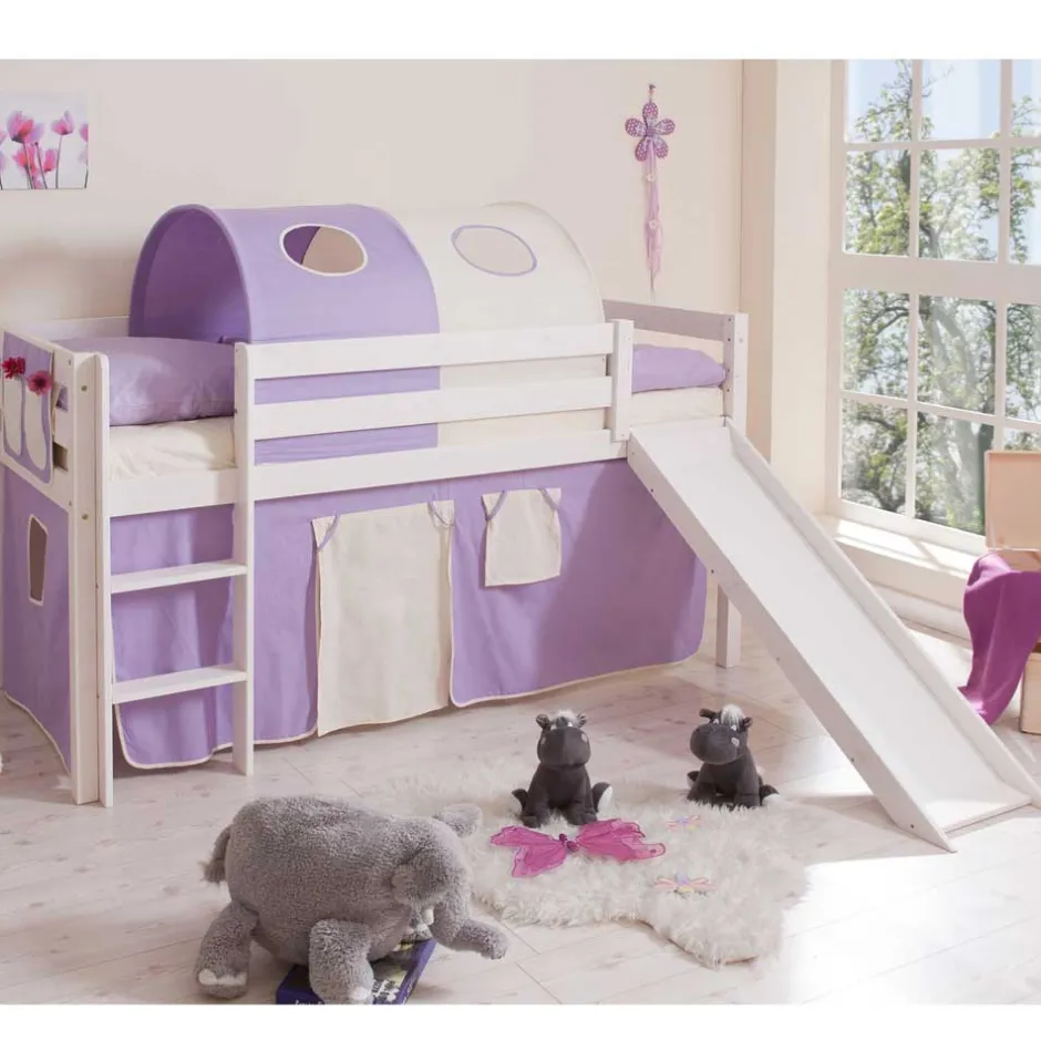 - Weißes Kinderhochbett mit lila-beigen Vorhängen