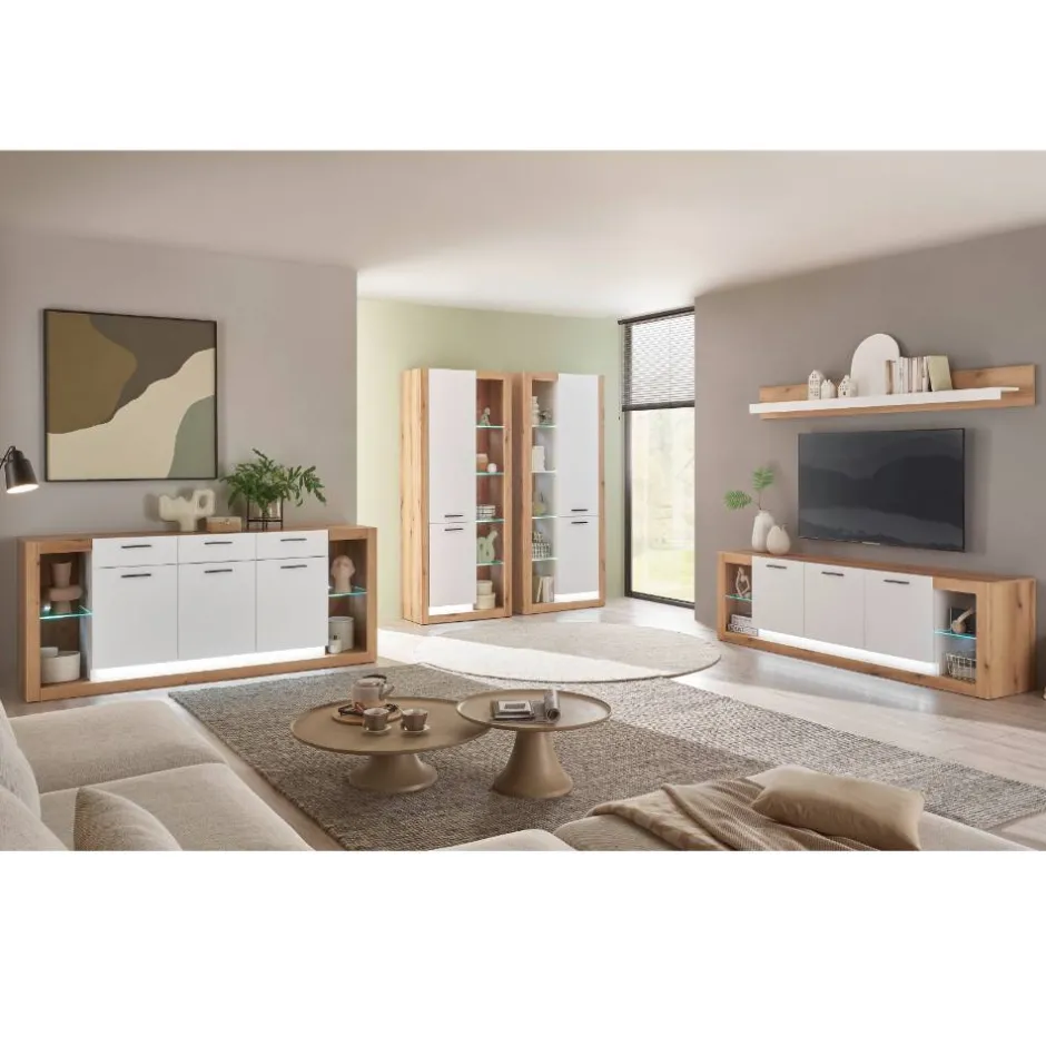 - Ansprechender Wohnzimmerschrank in Weiß supermatt und Eichefarben