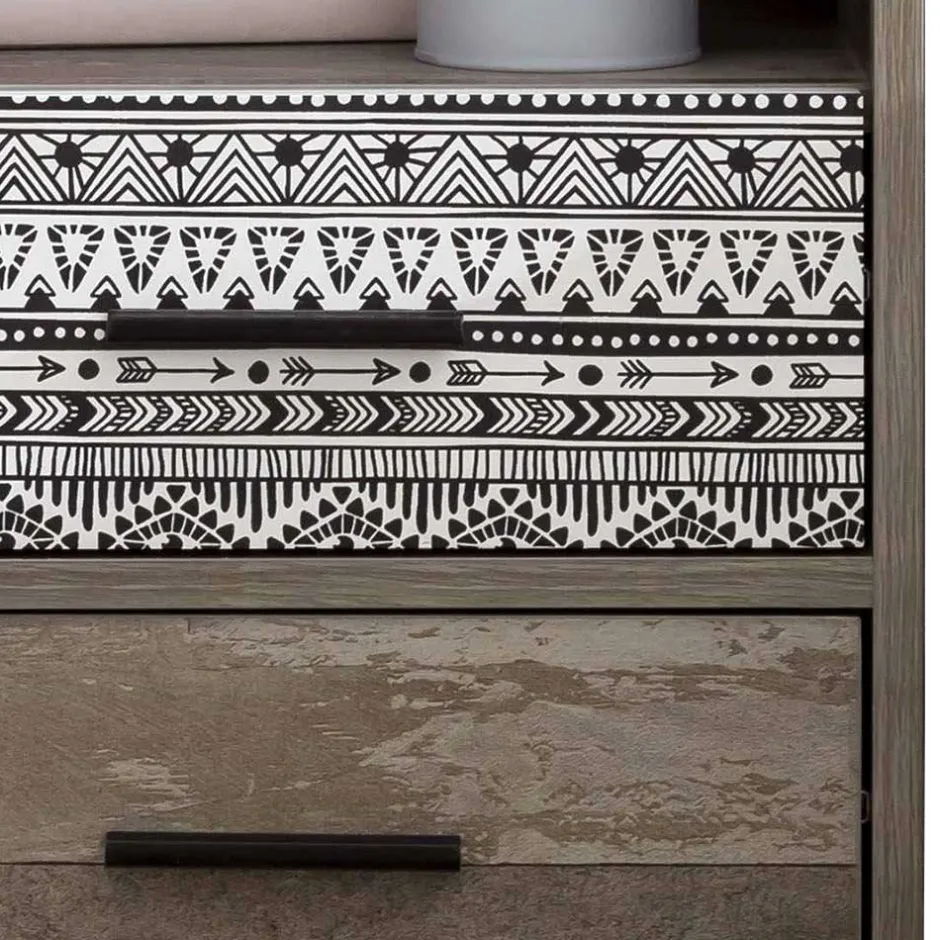 - Oberfläche pflegeleicht foliert in Holzoptik Grey Wash und in einem dezenten Tapetenmuster