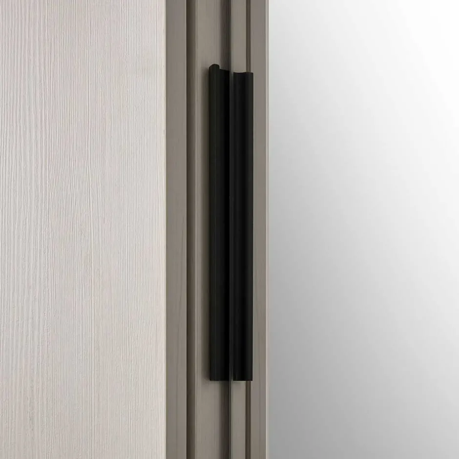 - Zwei Schiebetüren außen und eine Drehtür mit Spiegel mittig